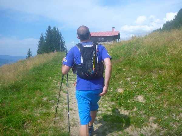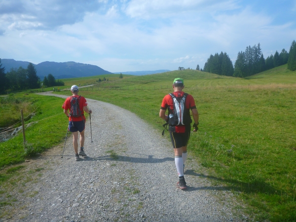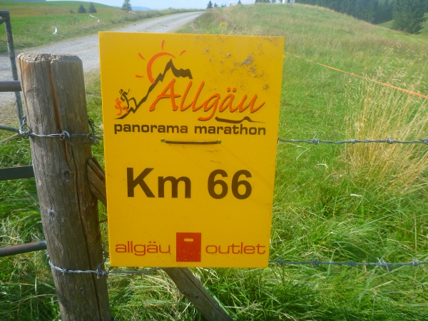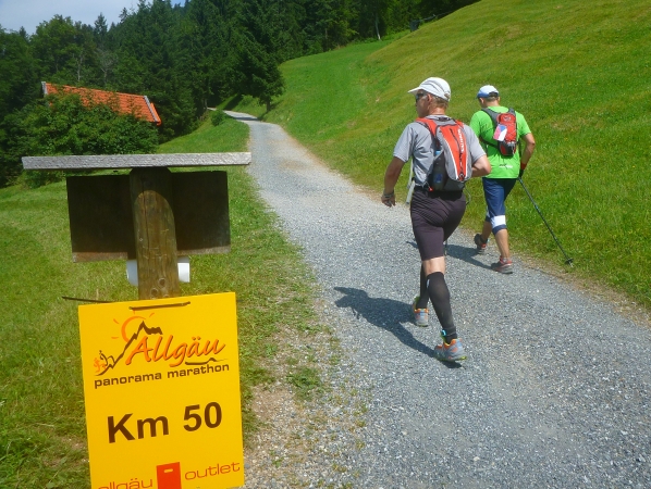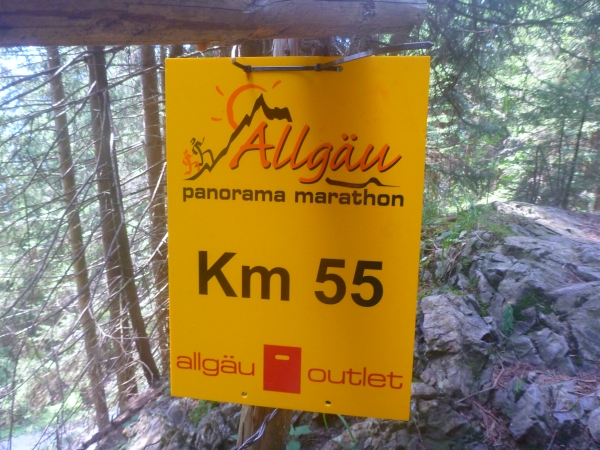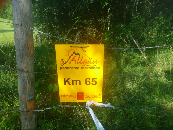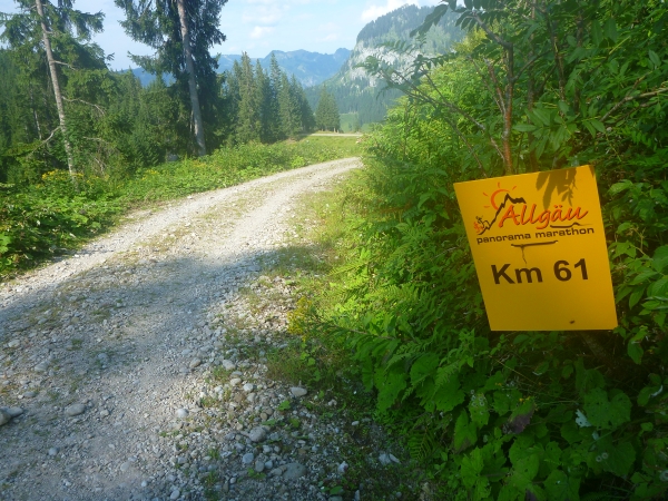 Km 60 liegt hinter mir. 1000 Höhenmeter gilt es abwärts zu laufen. Ein Fahrweg wird erreicht. Und wieder ist eine Labestation aufgebaut. Weiter geht’s bergab. Vor dem Altstädter Hof laufen wir ein Stück Straße, wechseln wieder auf Gelände und kommen beim Sonthofener Hof wieder an eine Labestation.