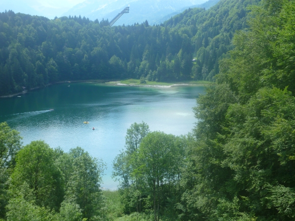 Und da liegen sie endlich vor uns. Der Freibergsee und die Heine-Klopfer-Skisprungschanze im Hintergrund. Der Anlaufturm der Schanze überragt das Gelände mit 72m und ist weithin zu sehen. Den Freibergsee selbst berühren wir nicht. Wir lassen ihn und die Schanze rechts liegen und stürzen hinunter in das Breitachtal Richtung Oberstdorf.