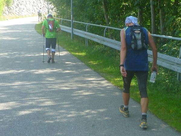Jetzt haben wir reichlich Schatten im Wald. An einer Abzweigung sitzt eine Familie auf dem Boden, macht Brotzeit und feuert jeden Läufer lautstark an. Danke! Der APM/APU hat zwar wenig Zuschauer, aber wir erfahren unzählige Anfeuerungen von denen die uns begegnen. Ein Satz bleibt mir besonders in Erinnerung: „Ich bewundere Euch“. Na, wenn das nicht anspornt.