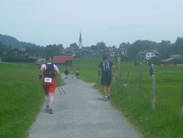 Ein Stück dürfen wir wieder die Straße abwärts laufen, dann wieder Wirtschaftsweg. Ich freue mich schon auf den Zieleinlauf am Freizeitbad Wonnemar. Km 66 wird passiert. Es folgt die letzte Labung an der Kapelle in Hofen und am dicksten Pfeil der gesamten Strecke rechts abbiegen in das Tal des Schwarzbachs, das uns die letzten Meter hinunter nach Sonthofen führt.