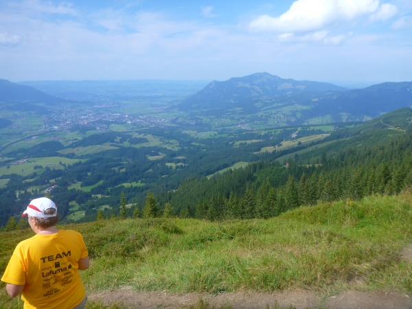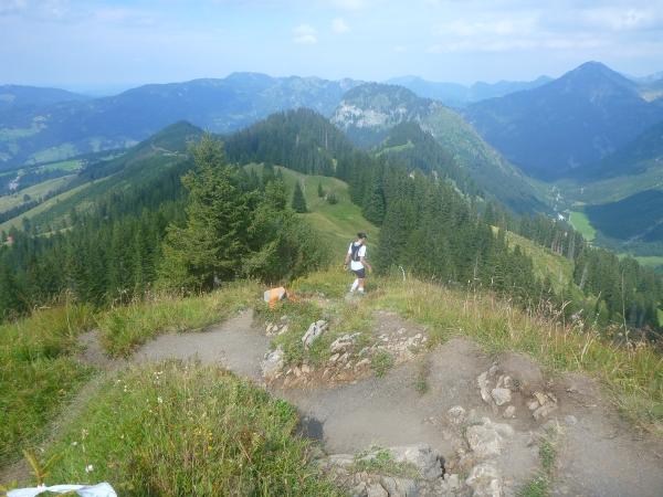Auf dem Gipfel des Sonnenkopfs ist sogar eine Labestation aufgebaut. Etliche Läufer sitzen um das Gipfelkreuz und genießen den Ausblick. Unter uns liegt Sonthofen und Richtung Norden grüßt der Grünten, der Wächter des Allgäus. Warum hatte ich nur am Mittwoch bei seiner Besteigung keine Fernsicht wie heute?
