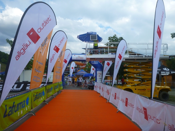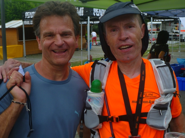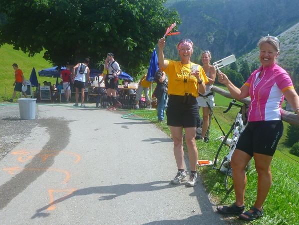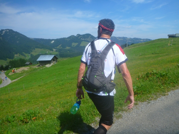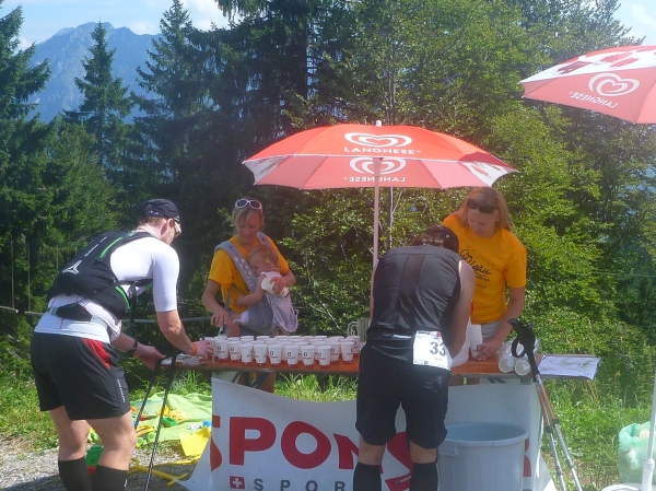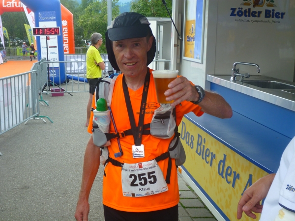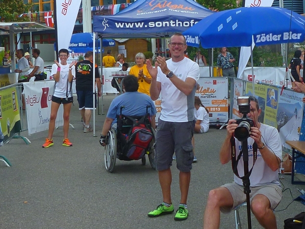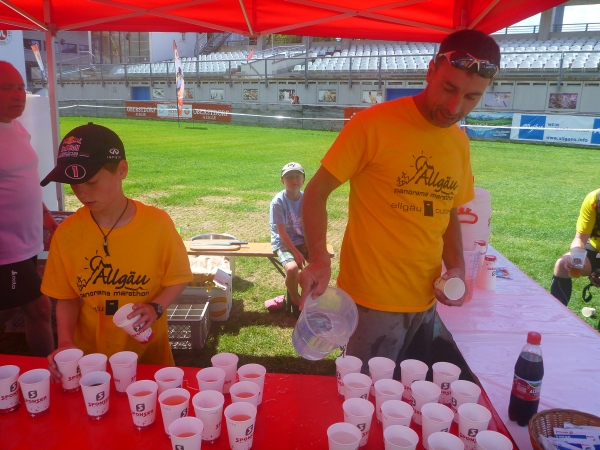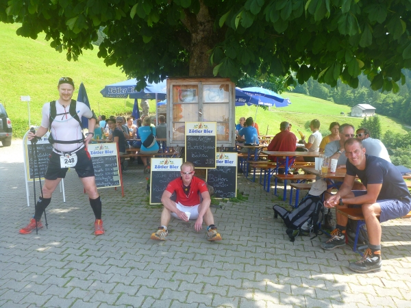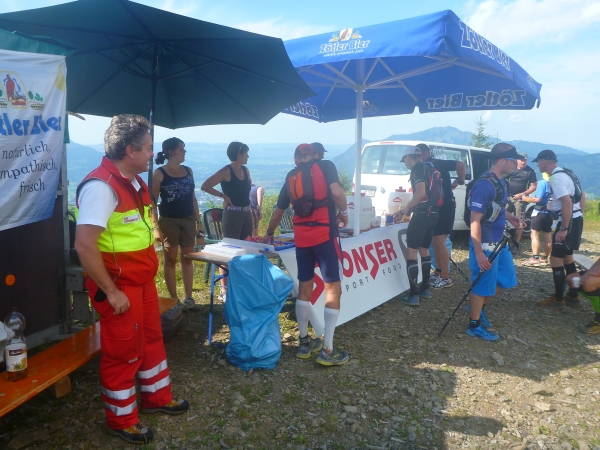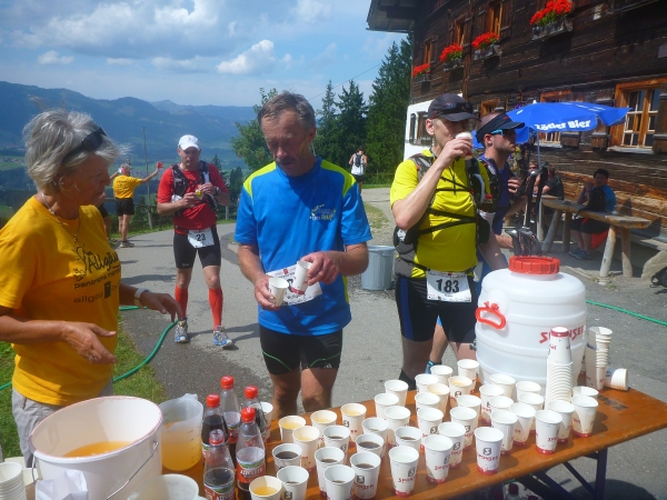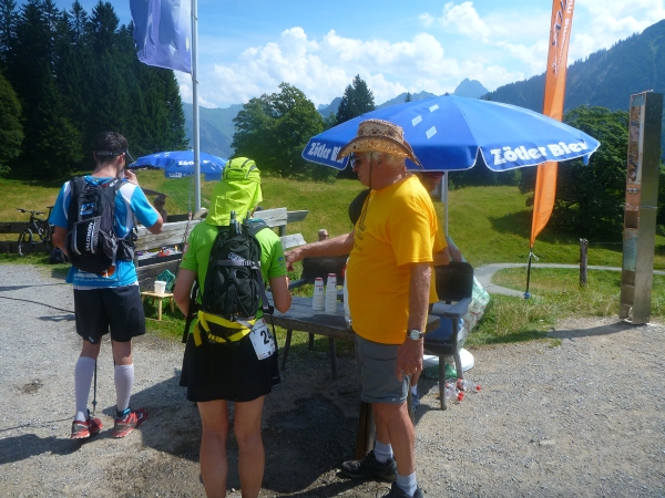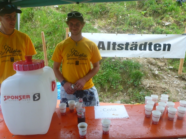 Einen besonderen Dank möchte ich an dieser Stelle den Helfern des Skiclub Altstädten stellvertretend für alle rund 200 Helfer des APM/APU aussprechen. Vor dem Schlußanstieg auf den Sonnenkopf haben sie kurz nach Km 57 eine Labestation aufgebaut. Ein Helfer steht sogar mit einer Gießkanne auf einer Leiter und bietet eine Dusche an. Herrlich, wunderbar. Ich danke Euch!!