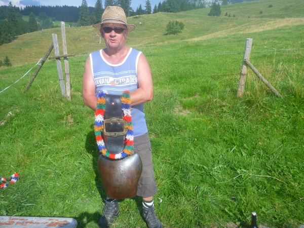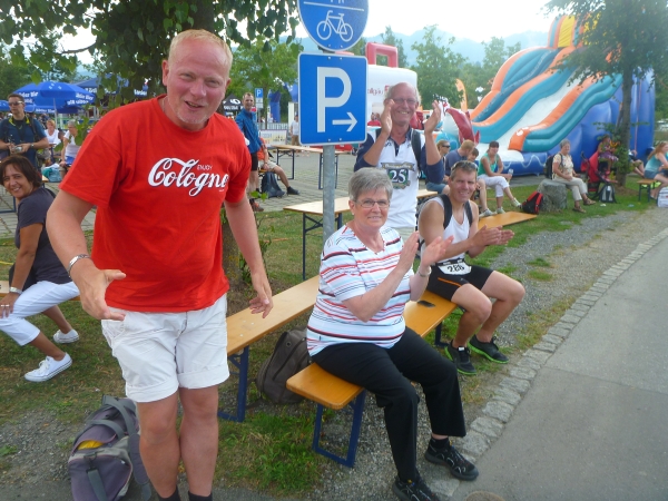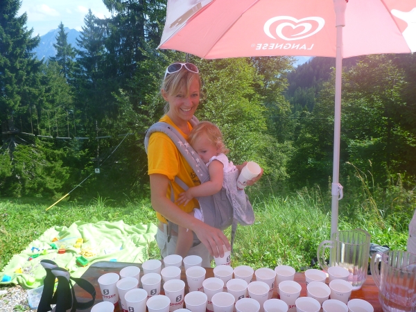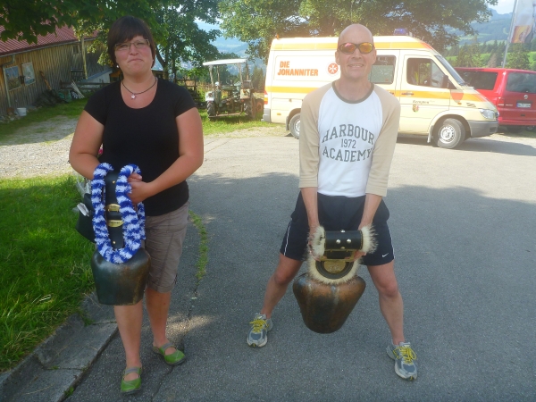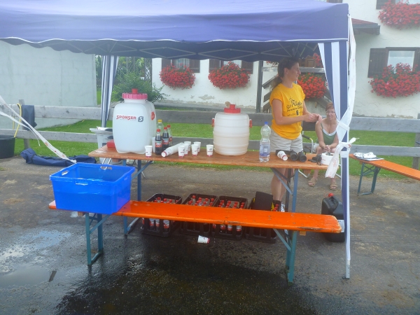 Auf dem Tisch steht eine Flasche alkoholfreies Bier. Ich frage, wem es gehört und schon gießt mir ein freundlicher Helfer einen Becher ein. Neben uns machen nette Menschen mit Kuhglocken ein tolles Spektakel. Stimmung ist angesagt.