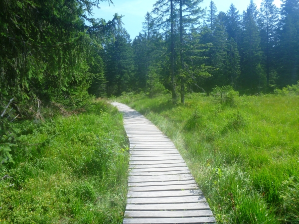 Eine kleine Sumpffläche wird auf Stegen passiert. Wir dürfen mal wieder abwärts laufen. Der Freibergsee erwartet uns. Vorher ist am Berggasthof Hochleite wieder eine Getränkeaufnahme angesagt.