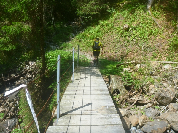 Wir laufen über eine schöne Holzbrücke über die Breitach. Im Tal angekommen geht es durch Wiesen Oberstdorf zu. Für Momente hat sich der Himmel etwas zugezogen, aber bald scheint wieder die Sonne. Wird wohl nix mit den möglichen Gewittern am Nachmittag. Ich behalte die Wolken am Himmel aber wachsam im Blick.