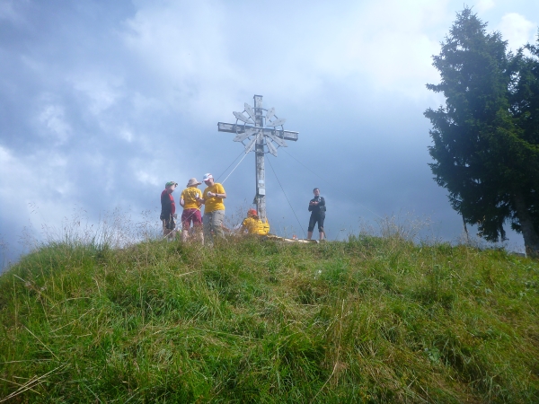 Ich schalte den Autopiloten ein und komme Schritt für Schritt nach oben. Und es geht. Von breiten Wegen ist nichts mehr zu sehen. Aber dafür hat es ordentlich Wurzeln. Plötzlich höre ich Anfeuerungen. Kurz darauf sehe ich das langersehnte Gipfelkreuz und damit das Ende des Aufstieges.