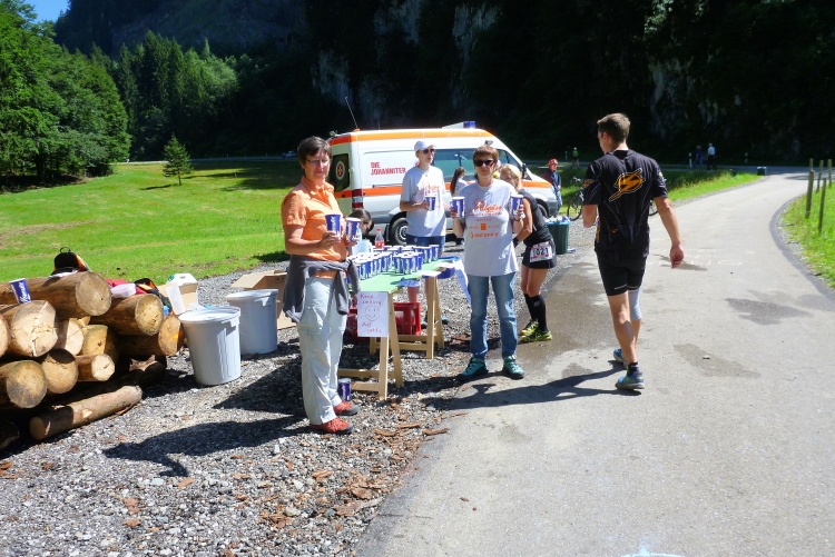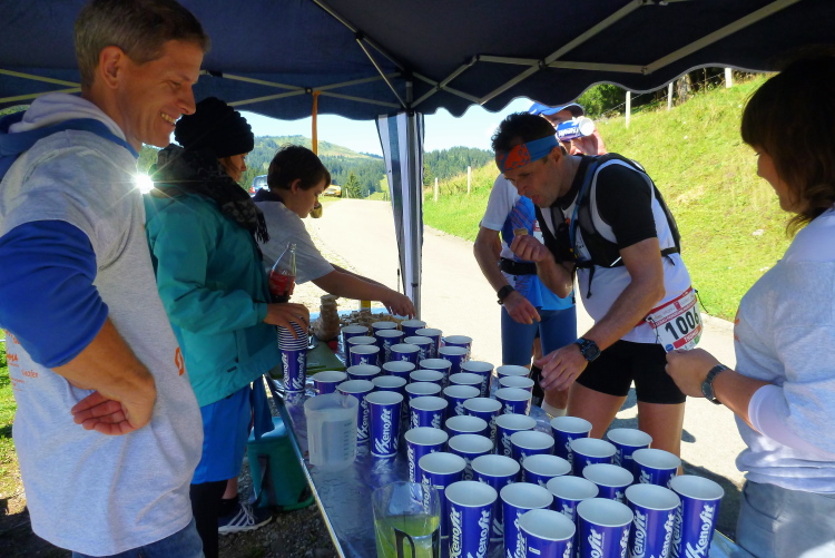 Schon am letzten VP ist mir innerlich der Kragen geplatzt: Warum eigentlich schaffen es so viele Laufkollegen trotz vorheriger intensiver Hinweise des Veranstalters nicht, ihre Becher an der Verpflegungsstelle zu leeren? Ist es die Angst, entscheidende fünf bis zehn Sekunden im hinteren Drittel zu verlieren, die sie dazu veranlasst, ihre Becher manchmal nur zehn Meter hinter dem VP am Wegrand zu entsorgen und den Helfern so noch mehr und vor allem unnötige Arbeit zu machen? Wirklich ärgere ich mich über die Deppen, die ihre Geltütchen unterwegs leeren und auf Wiesen entsorgen.