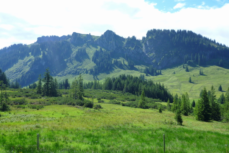 Rechterhand liegt die Nagelfluhkette, ein überwiegend in Germanien gelegener Höhenzug mit sechzehn Gipfeln bis 1.834 m Höhe (Hochgrat). Sie gehört zu den letzten höheren Erhebungen der Alpen, ehe sich weiter nördlich das Alpenvorland des Allgäus anschließt. Wieder sind wir auf einem Wurzelweg, als für mich überraschend schon das 10 km-Schild erscheint. 1:20 Std. habe ich bis hierher benötigt, das sieht wohl hinsichtlich des Zeitdrucks ganz gut aus. Auch die Aussichten werden mit der gewonnenen Höhe immer besser, mir geht zunehmend das Herz auf. Immer aufs Neue sind die Trampelpfade in den Hügeln schön anzusehen, auf denen sich der bunte Läuferlindwurm bis zum Horizont windet. Auch das macht für mich den Reiz des Laufens in den Bergen aus.