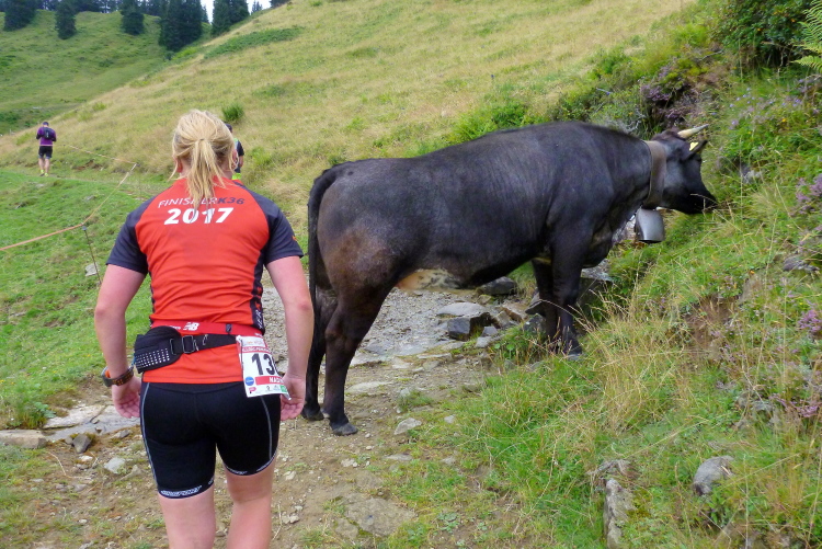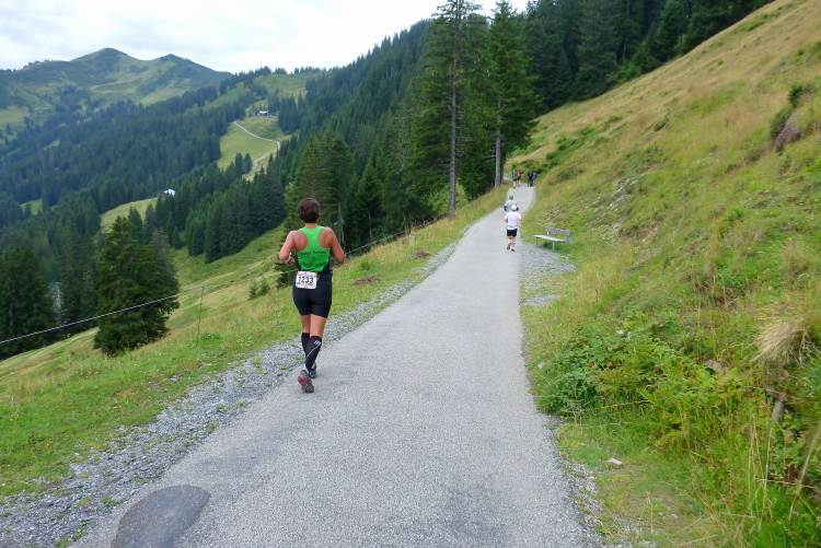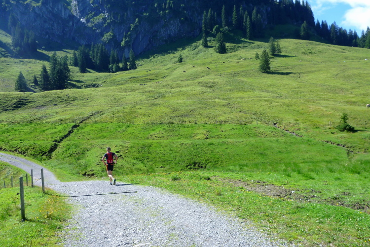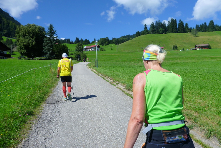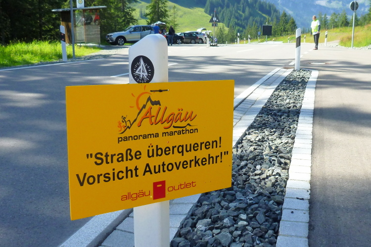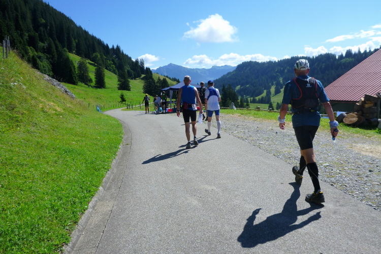 Nach gesicherter Überquerung einer Straße ist km 20 erreicht. Wunderschöne Wege führen um die Schönberg Alpe und den Schafkopf (1.627 HM). Überhaupt bestätigt dieser Lauf sämtliche Klischees, die für das Allgäu stehen: Traumhafte Aussichten, wunderbare Berge, Häuser, Almen, Kühe mit Glocken, blauer Himmel, es fehlen wirklich nur noch Heidi, Ziegenpeter und der Alm-Öhi. Dann heißt es: „Marathon links, Ultra rechts“ und schon bald folgt das Grauen. Jedoch nicht die Freiburger Alpe bei ca. km 23,8, die Keller Alpe, die Untere Grund Alpe oder die Lochbach Alpe, nein, es ist das Lochbachtal, das wir zwischen den km 23 und 30 auf steilem Asphaltweg herunterdonnern. OK, mancher hat Spaß daran, reihenweise werde ich überholt, aber für meine Oberschenkel ist das nur furchtbar. Wie die anderen das folgenlos machen, ist mir ein Rätsel. Am Folgetag wird die mir immanente jugendliche Geschmeidigkeit doch arg getrübt sein, vor allem bergab.