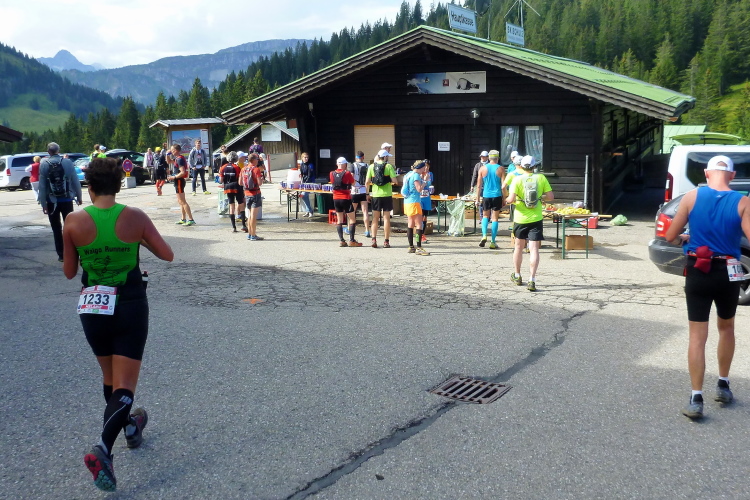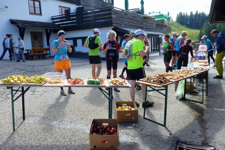 Die Grasgehrenhütte bei ca. km 18,2 auf 1.447 HM bietet Vollverpflegung: Wasser, Iso, Cola, Gels, Riegel, Kuchen, Brot, Salz etc., alle anderen Verpflegungspunkte haben Wasser, Iso, Obst und am Ende auch Cola im Programm. Erstaunt bin ich, tatsächlich noch Kuchen zu bekommen, schließlich ist der berüchtigte Kuchenvernichter Klaus Klein vor etwa zwei Stunden hier vorbeigekommen. Klausi, Du bist so gut zu mir, danke! Obwohl – verstehen kann man ihn, denn Kuchen hat nur wenige Vitamine, daher muss man relativ viel davon essen. Ich vergaß übrigens zu erwähnen, dass die ersten 22,5 km der Marathon- und Ultrastrecke identisch sind. Nach 2:35 Std. und ausgiebiger Verpflegung ziehe ich weiter, auf den Cut off von 3:15 Std. habe ich also 40 min. Luft und bin deutlich auf der sicheren Seite.