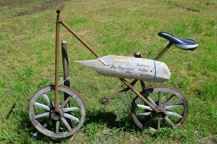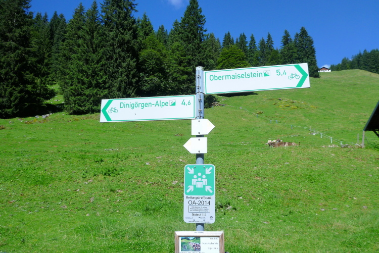 Unterhaltsam ist es, als ob die nette Gegend nicht schon genug Abwechslung böte. Wolfgang Suttner, bisher nur über das Gesichtsbuch bekannt, spricht mich an und auch mit der Saarländerin Uli, deren sehr viel schnellerer Mann immer brav an der nächsten Verpflegungsstelle auf sie wartet, ist unterhaltsam und nett. Die ersten Almweiden mit ungezählten grasenden und bimmelnden Kühen sind sehr schön anzuschauen und schon ist die sog. Weltcuphütte, ein gemütliches Ausflugslokal bei ca. km 7,8 erreicht, an der zwei Bahnen, nämlich die Ossi-Reichert-Bahn und der Weltcup-Express ihre Bergstation haben. Wir umlaufen das Ofterschwanger Horn (Gipfel auf 1.406 HM) und passieren immer öfter Drehkreuze und im Boden eingelassene Viehgatter, die die Rinder dort halten sollen, wo sie hingehören.