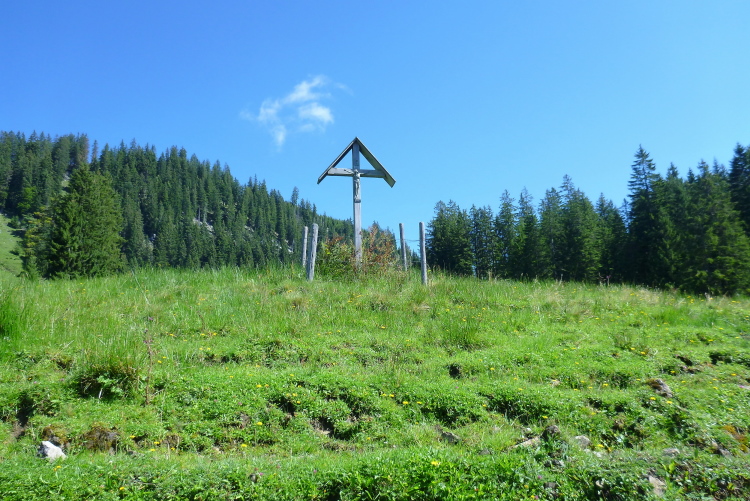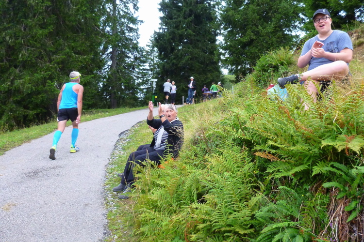 Wenig später ist der Gipfel des Weiherkopfes auf 1.650 HM erreicht, an dessen Gipfelkreuz wir unter dem Beifall einiger rastender Wanderer den ersten längeren Bergabweg nehmen. Eng ziehen sich die Serpentinen und holzbalkengesicherten Treppen dahin. An einigen weiteren Alpen, u.a. dem Berghaus Schwaben bei ca. km 14,7 vorbei, erreichen wir den nächsten VP, der wieder allerlei Flüssiges und Obst (Bananen und Melonen) bietet. Wellig geht es auf und ab, der Untergrund wird ob des vielen Regens der vergangenen Tage und der zahlreichen schweren Kühe immer matschiger. „Sauber!“ spornt uns mancher Wanderer und Fan an, jedoch unsere unteren Hälften können das zunehmend nicht mehr bestätigen. Weit reicht der Blick ins Tal, dann erblicke ich ein wichtiges Zwischenziel.