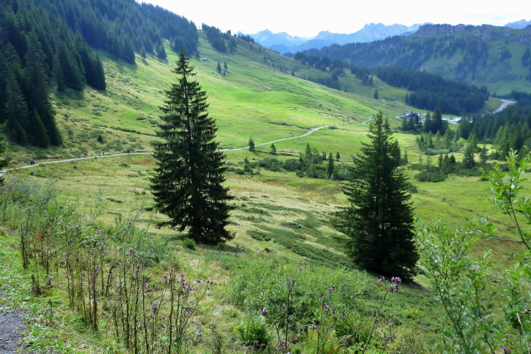 Einige Rindviecher (mit Euter) stehen mitten im Weg, manche(r), einschließlich des Autors, geht mit einem leicht mulmigen Gefühl an ihnen vorbei, denn man hat gerade in der letzten Zeit von einigen tödlichen Zwischenfällen gehört. Aber die hier sind brav. Die bald passierte Fahnengehren Alpe ist eine für das Allgäu ganz typische, die nur von Mai bis Mitte September bewohnt und bewirtschaftet ist. Und zwar ebenso lange, wie die Jungtiere, die sogenannten Schumpen, die Bergfrische und die saftigen Kräuter genießen dürfen, bevor es im Herbst wieder Richtung Tal geht.