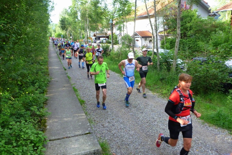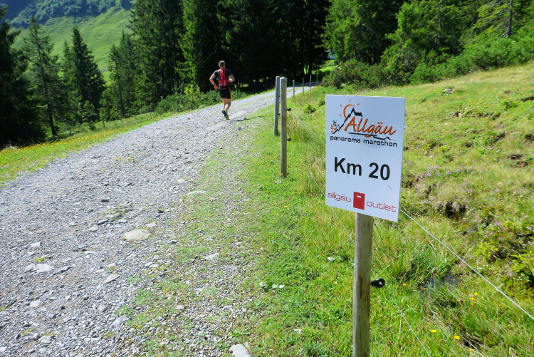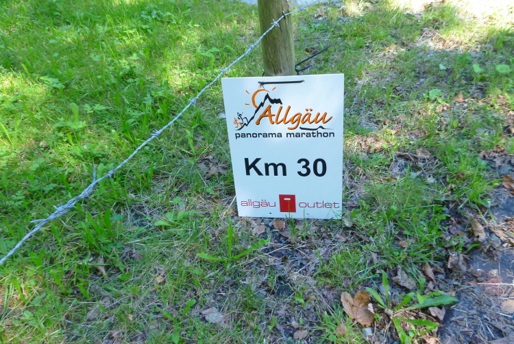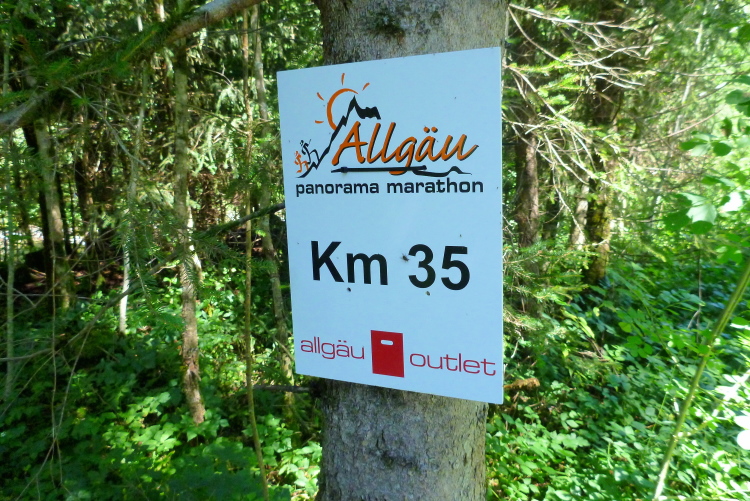 Bei ca. km 29,6 ist die Qual überstanden und das Ende des Lochbachtals erreicht. Nach einem Felsdurchbruch biegen wir nach links in den Wald ab. Was vorher als Warnung gedacht war, nämlich für die jetzt folgenden ca. hundert Höhenmeter noch ein paar Körner übrig zu behalten, erweist sich für mich als Segen. Endlich nämlich darf ich bergauf gehen! Ehrlich, es ist eine Erlösung. Erst etwas über einen schönen Trail durch den Wald, dann auf Asphaltweg durch wunderbare Wiesen führt der weitere Weg. Durch die Ortschaft Obermaiselstein über die Straßenkreuzung Bolsterlang bei ca. km 34,1 sind schließlich 35 km abgearbeitet und es geht flach entlang des Baches Weiler Ach bis zu dessen Mündung in die Iller weiter.