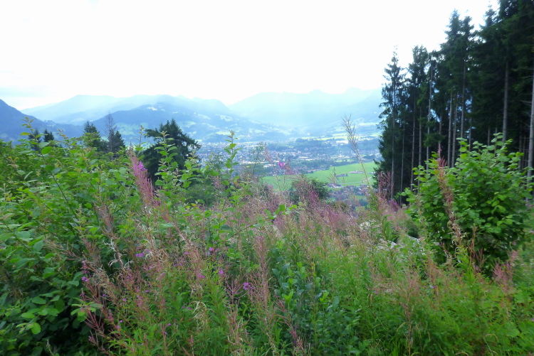 Schnell haben wir zwei Straßen unter- sowie die Iller überquert und arbeiten uns die ersten Meter parallel dieses Flusses voran. Hinterm Sonthofener See geht’s scharf links ab in die Botanik. Die ersten Höhenmeter leiten uns von Sonthofen weg und im Umdrehen leuchten der Grünten („Wächter des Allgäus“) und die Stadt im leichten Dunstschleier, der sich aber recht flott auflösen und viel Sonnenschein Platz machen wird. Für diejenigen, die diesen Bericht später lesen werden, sei gesagt, dass wir Riesenschwein mit dem Wetter haben. Gerade rechtzeitig hat uns die sibirische Kälte mit tagsüber bis zu schlappen acht Grad im Dauerregen verlassen, daher kann ich in „Kurz“ laufen. Die morgendlichen 14° werden im Tagesverlauf bis auf 24° steigen. Nicht wenige haben dem Wetter nicht getraut, sind viel zu warm angezogen und streifen die überflüssige Kleidung alsbald ab. Wohl dem, der für diesen Zweck einen Rucksack dabei hat (ansonsten benötigt man keinen).