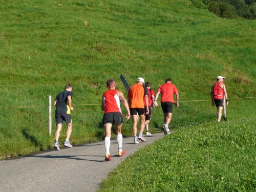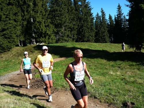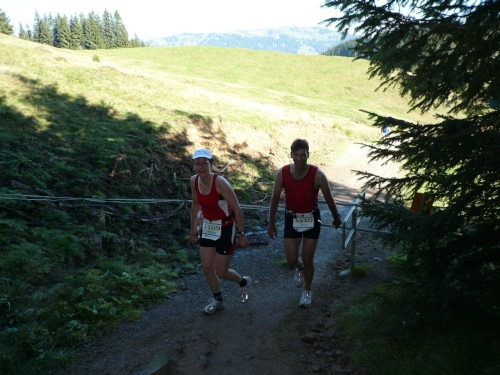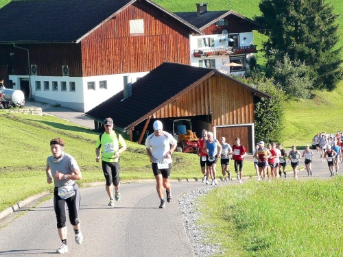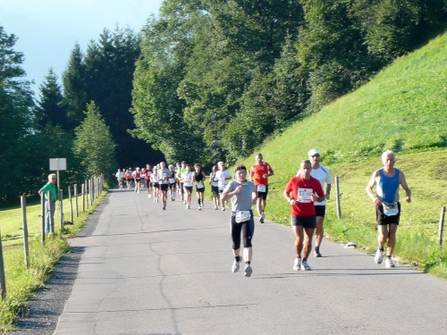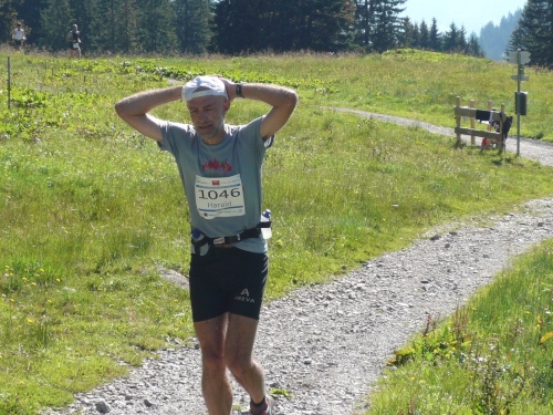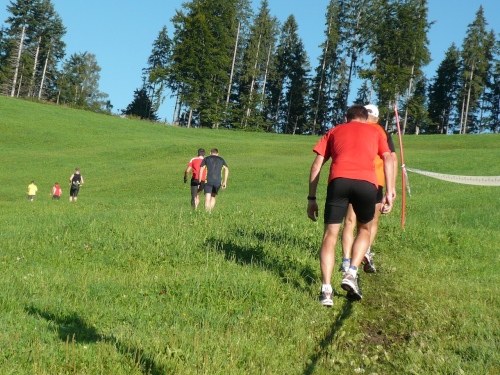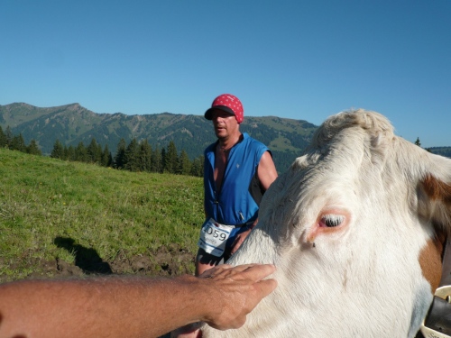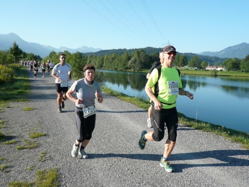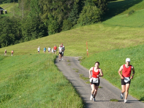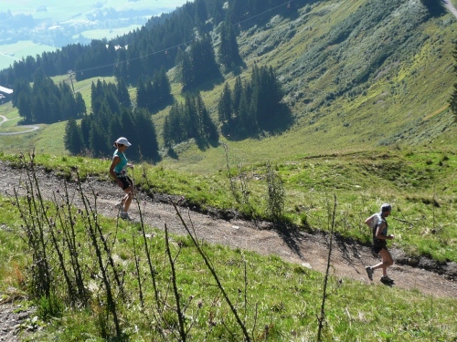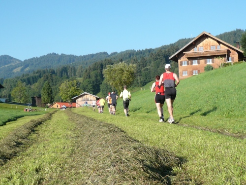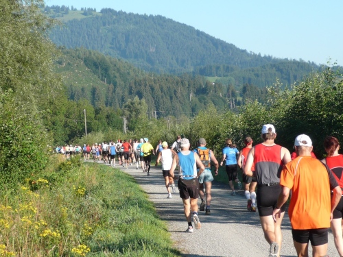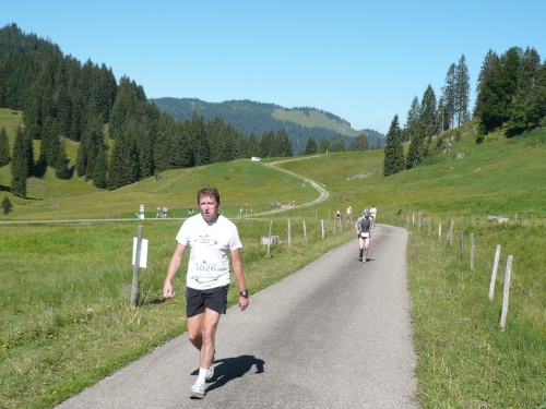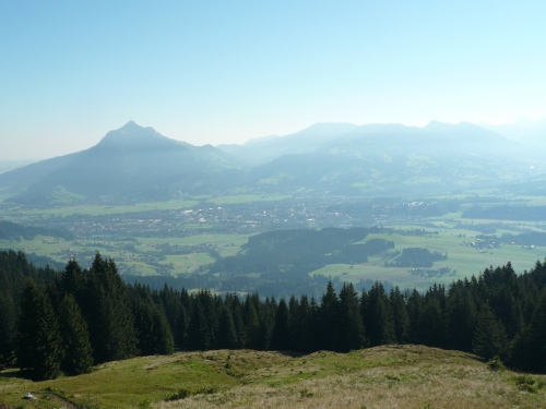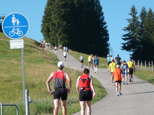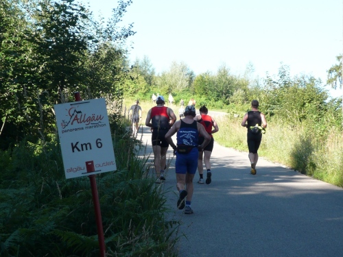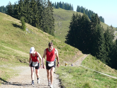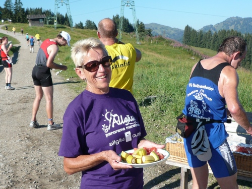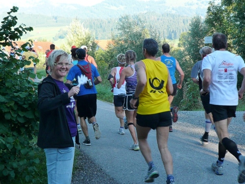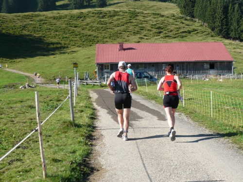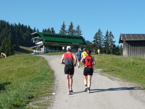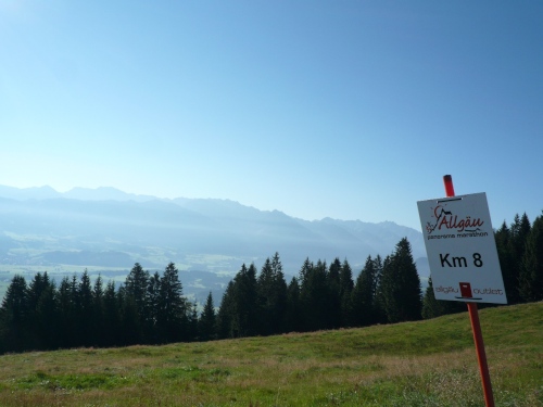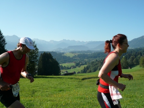 Auf meiner Höhe, mal vornedran, mal knapp dahinter läuft ein Pärchen. Petra Neumann und Jens Jäger haben ihren Bergurlaub im Zillertal mit dem heutigen Marathon gut abgeschlossen. Gut trainiert dürften da beide schon sein. Wir gewinnen jetzt schon viele Höhenmeter, die Aussicht auf Sonthofen, Immenstadt und in Richtung Oberstdorf ist herrlich. Am gegenüberliegenden Grünten lässt sich unsere Höhe gut einschätzen.