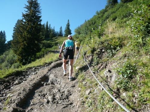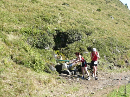 Kilometer elf, das Rangiswanger Horn ist rechts zu sehen. Da müssen wir nicht hinauf. An einer folgenden Wassertränke holt man sich schon eine erste Erfrischung. Wieder ein interessantes Motiv. An der nächsten Rampe sind sogar an der Seite Seile angebracht, so steil geht es da hinauf. Susanne Nau geht vor mir und benützt die Unterstützung.