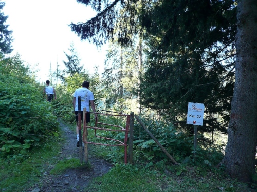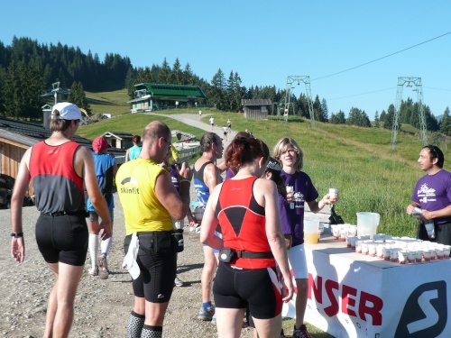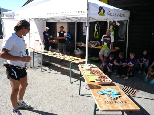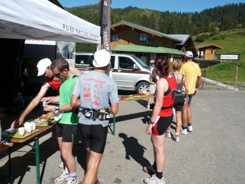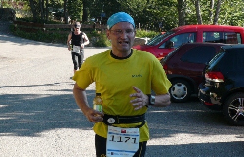 Nach Kilometer vier gibt es schon was für die Gurgel. Wasser und Iso satt. Einige der rund 200 Helfer sind hier schon am Einschenken und Zureichen. Weiter gestaltet sich unser Weg nicht besonders schwierig. Wer sich seine Kraft einteilen kann, macht bei den ärgsten Rampen langsam und geht. Das nächste Erholungsstück kommt dann bestimmt. Für Ersttäter ist dieser Bergmarathon grad richtig zum Ausprobieren.