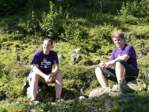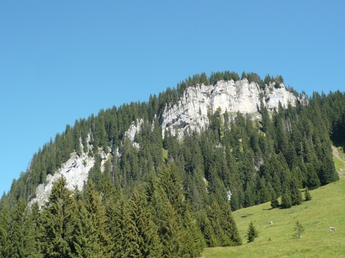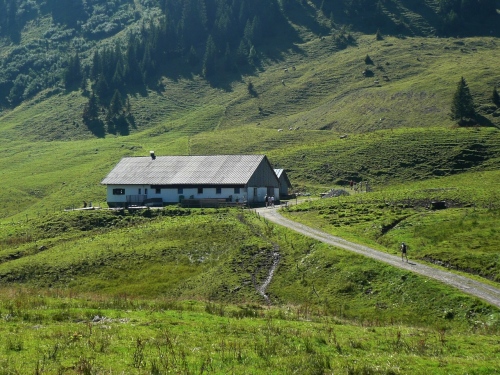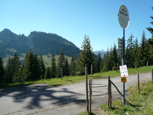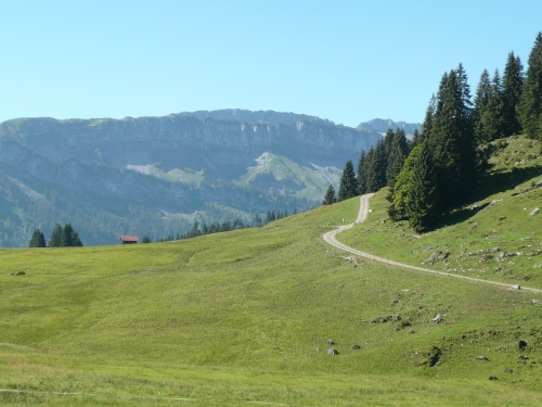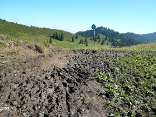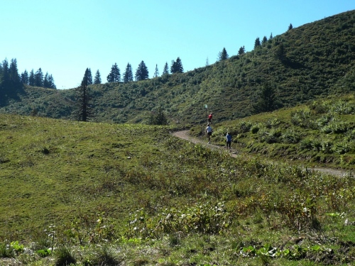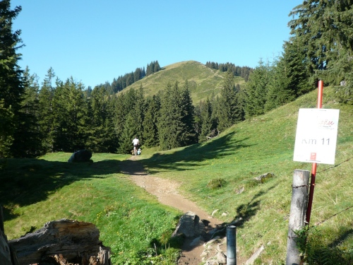 Nach einem weitern Aufschwung, der zum Teil schmierig und durch Kuhfladen auch gefährlich (Tretminen) ist, kommt ein rustikaler Teil mit Wurzeln, Steinen und Stufen. Einen guten Kilometer lang dauert diese Einlage. Ein paar Mountainbiker haben sich diesen Weg auch ausgesucht und tragen, weil’s nicht anders geht, ihren fahrbaren Untersatz. „Jetzt muss ich Euch überholen und dann könnt Ihr mich gnadenlos versägen,“ lasse ich bei meinem Überholmanöver los.