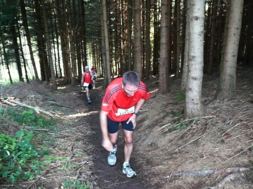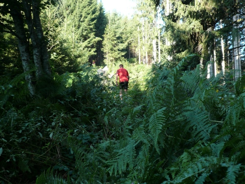 Bevor der Trailpfad in den Wald führt, stehen zwei Helfer. „Der Platz kostet Vergnügungssteuer,“ lasse ich los. Worauf die Helferin kontert: „Die haben wir schon abgedrückt!“ Im Wald geht es steil bergan, alle gehen. Teilweise herrscht Schleudergefahr, der Boden ist schmierig. Dann müssen wir durch fast mannshohen Farn.