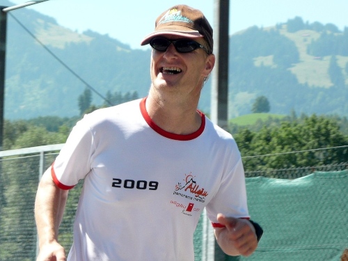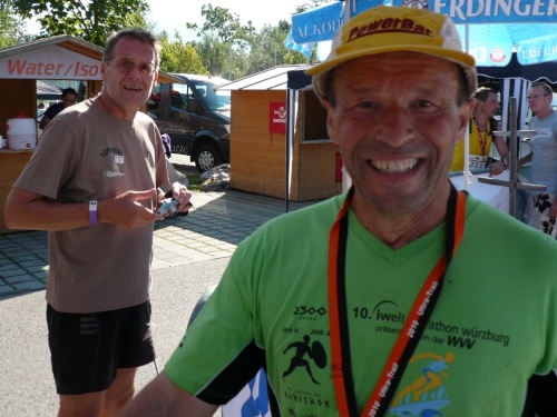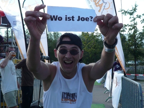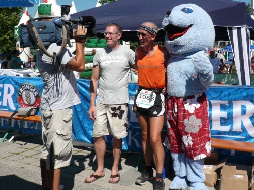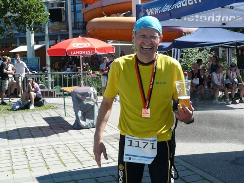 Ich glaube zwar, dass ich vielleicht noch mal zur Petra auflaufen könnte, lasse das aber bleiben und bringe die letzten Meter bis zum Wonnemar hinter mir. Dort im Ziel wird jeder von Axel Reusch persönlich zu seiner Leistung gratuliert. Aufmerksam wird ein Kamerateam auf mich, das die Blumen an meiner Kopfbedeckung sieht. „Der hat noch Zeit zum Genießen,“ höre ich. Erst spät am Abend bin ich dann mit einem entsprechenden Kommentar im Bayerischen Fernsehen zu sehen. Jetzt samma berühmt.