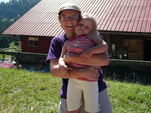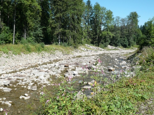 Untere Gundalpe und Lochbach-Alpe sind die nächsten Zwischenziele. Später gibt es wieder mehr Schatten, auch nimmt das Gefälle zu und wird unangenehm. Ich komme auf eine abstruse Idee und stecke mit zwei Bergblumen ins lockige Haar, das mich schon vor langer Zeit verlassen hat. So gibt eben das Stirnband den Blumen den nötigen Halt.