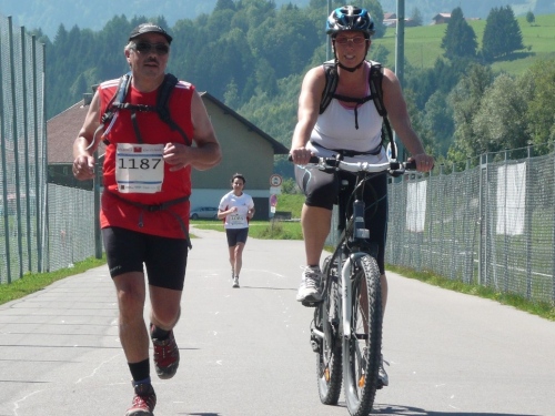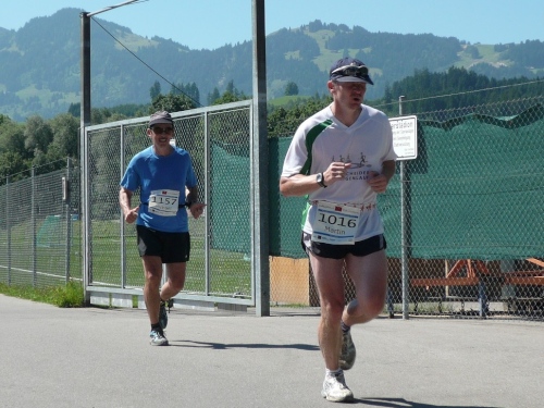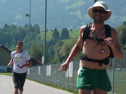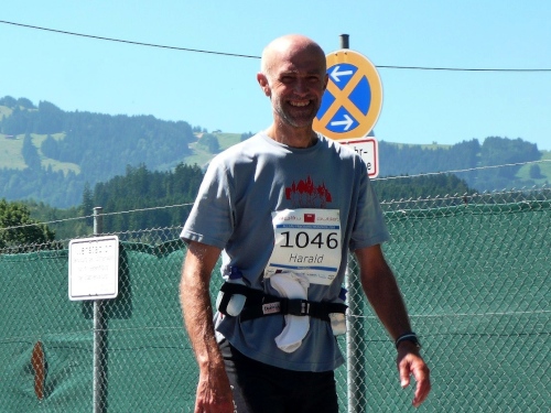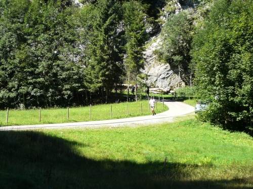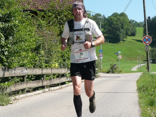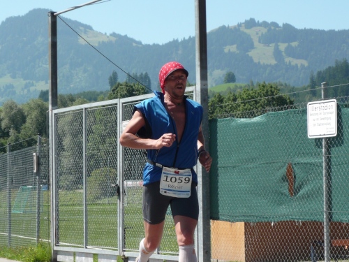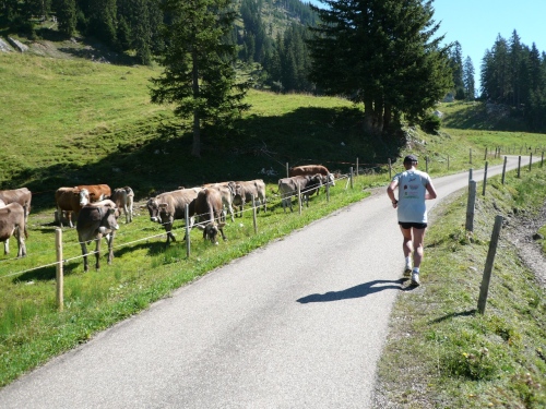 Unten wartet dann eine geteerte Rennpiste bis zum Berghaus Schwaben (Kilometer 15). Das größte Stück davon geht leicht bergab, da kann man brettern. Aber Vorsicht ist doch geboten, denn eine Läuferin ist vor mir gestürzt und hat sich Schrammen an Knie und Hand geholt. Zum Berghaus steigt es wieder an, ich verfalle wieder in den Wanderschritt. Oben wartet eine weitere V-Stelle.