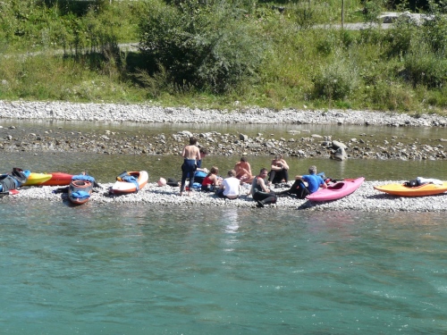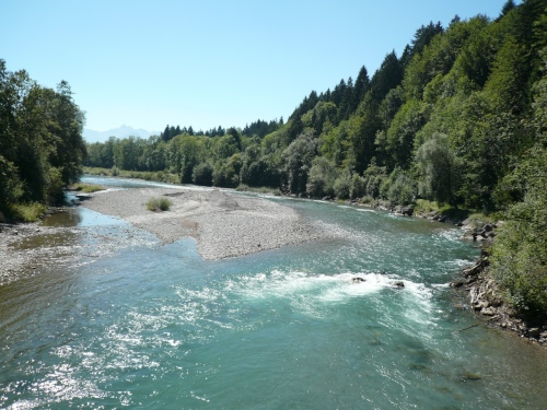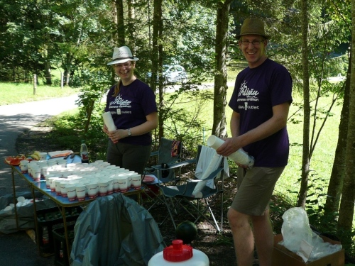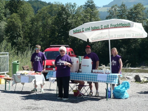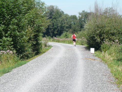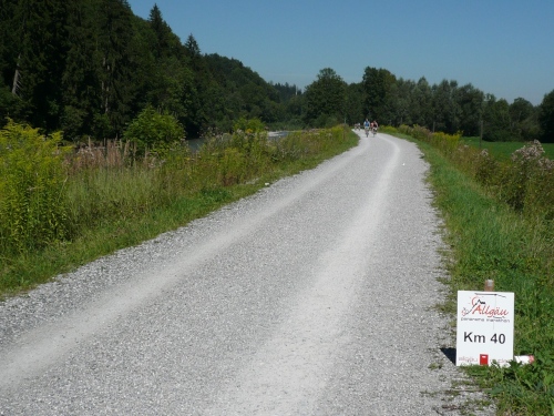 Bei Weiler unterqueren wir die Bundesstraße 19 und dann geht es an die Iller. Nur noch gut vier Kilometer. Vorletzte V-Stelle. Wieder gute Verpflegung. Ich habe jedoch was erspechtet. Unter dem Tisch im Schatten ein Eimer. Ich erkenne einen Flaschenhals. „Was hast Du da drin“ Und. „Kriege ich einen Schluck?“ Bier, meine Rettung. Daniel würde mich wieder als Schnorrer titulieren. Ich halt es lieber praktisch, denn Bier schmeckt kühl am besten und wenn der Hopfentrank warm ist, dann sauft des koa Sau. Meinen Alkexzess nützt dann die Petra gnadenlos aus und lässt mich stehen. Mit einem „Du hast jetzt einen durstigen Läufer gerettet“ mache ich mich auf den Weiterweg.