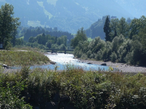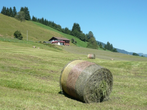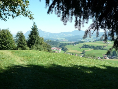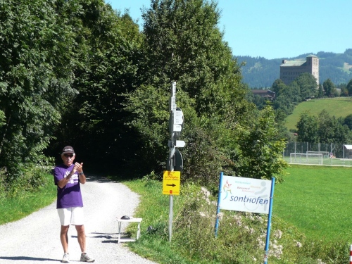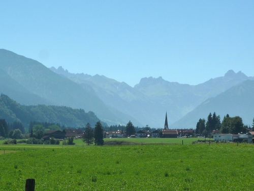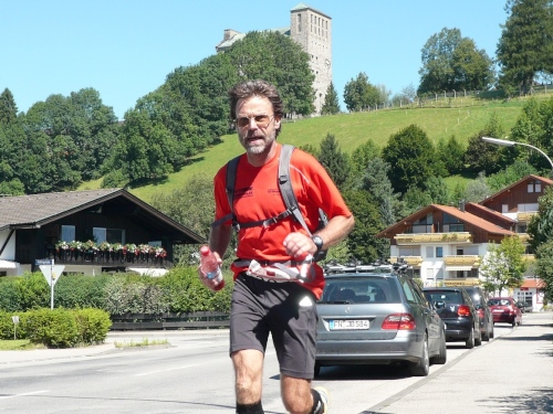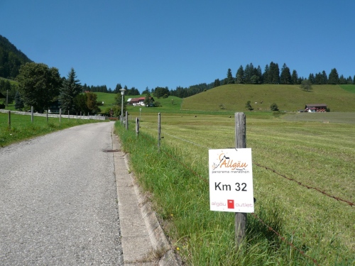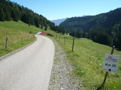 Dann wartet noch eine üble Steigung hoch zum Herrenberg, gut 50 Höhenmeter. Obermaiselstein ist der nächste Anlaufpunkt. Da kommt die Straße vom Riedbergpass herunter. Wir tangieren nur kurz den Ort, bevor wir dann entlang der Weiler Ach, einem Bachlauf, einige Kilometer sammeln. Das Feld hat sich längst gehörig auseinandergezogen. Lediglich an den V-Stellen trifft man vielleicht noch Leidensgenossen. Einer hat Probleme mit seinen Kreislauf. Ihr wird ein Campingstuhl und Cola angeboten.