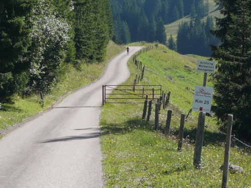 Die Trennung der Strecke, Trailer rechts Richtung Rohrmoos und wir links. Ein Helfer steht da und weist ein. Wir biegen in Lochbachtal hinunter. Jetzt können wir wieder Tempo auf der Teerstraße aufnehmen, wenn nicht die Sonne so brennen würde. Schatten ist gerade Mangelware.