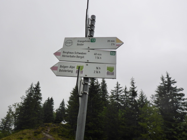 Kuhglockengebimmel liegt in der Luft. Der Anstieg aufs Rangiswanger Horn ist leichter als gedacht. Ich brauche nicht mal die Stahlseile, die hier zur Sicherheit am steilsten Stück angebracht sind. Unter uns liegt Sonthofen, vor uns ein lichter Nadelwald - beides im Nebel. Beim Aufstieg zum Weiherkopf beginnt es plötzlich zu graupeln. Jetzt fehlt bloß noch Schnee, kalt genug fühlt es sich an. Heute hat keiner Lust auf ein Gipfelfoto und so mache ich mich schnell an den Abstieg. Wieder freue ich mich über meine Schuhe. Es geht steil bergab; dennoch habe ich einen super Halt. Dass ich nichtsdestotrotz vorsichtig bin, versteht sich von selbst.