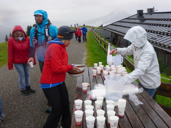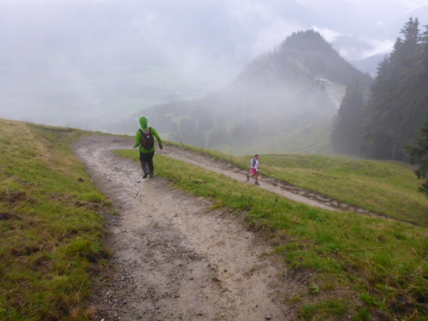 Hinter km 4 kommt bereits die erste Getränkestation. Eine kurze Bekanntschaft mit der Wiese zeigt, dass die Füße heute nicht trocken bleiben werden. Dann kommt ein kurzes Stück im Wald steil bergauf, Matschlaufen pur. Wir erreichen die Straße zum Allgäuer Berghof. An der VP Weltcup Hütte Ofterschwang bei km 9 gibt es Bananen. Die Helfer stehen bereit, um die Läufer so gut es geht zu bedienen. Sie haben sich dick eingepackt, sind aber ansonsten ungeschützt Regen und Wind ausgesetzt.