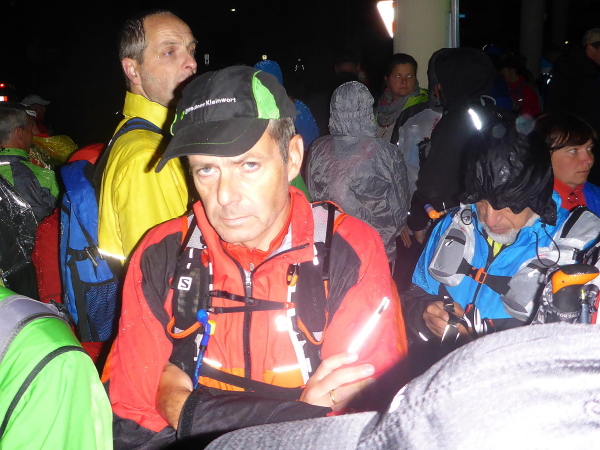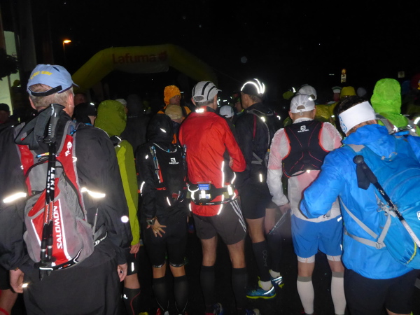 Dann überschlagen sich die Ereignisse. Kaum hat sich die Menge vor dem Starttor versammelt, geht es auch schon los. Ein paar Zuschauer verabschieden uns und wir versuchen mit Bewegung die steifen Gelenke warm zu bekommen. Bei noch düsterem Licht muss man sich ganz schön konzentrieren, um im Pulk keinem auf die Füße zu treten. Aber im Regen gibt es eh nicht viel zu sehen und so lasse ich den Kopf einfach unten. An der ersten Steigung verabschiedet sich Norbert, der bergauf deutlich schneller ist.