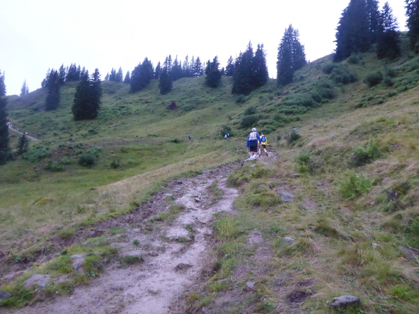 Ich nutze die Steigung, um im Gehen meine Regenjacke auszuziehen. Immer wieder spitzt die Sonne kurz hervor und sofort spürt man die Wärme. Ich habe wieder nette Unterhaltung. Leider ist er bergauf etwas schneller. Auf dem folgenden Trail behalte ich ihn aber im Blick. Der Weg ist hier nun schwierig zu laufen. Große Steine bilden hohe Stufen die es bergab zu bewältigen gilt. Ich überlege, ob es nicht leichter wäre, den direkten Weg den bewaldeten Abhang hinunter zu nehmen. Hier sind definitiv schon andere gelaufen. Ich sehe meinen Laufkollegen auf dem Weg kämpfen und versuche es. Mensch, ist das steil. Meine Schuhe finden diesmal keinen Halt und ich rutsche unelegant auf dem Hintern den Hang hinunter. Total verdreckt lande ich wieder auf dem Weg. Toll, das darf ich keinem erzählen! Nur Euch.