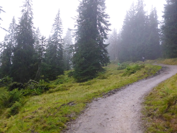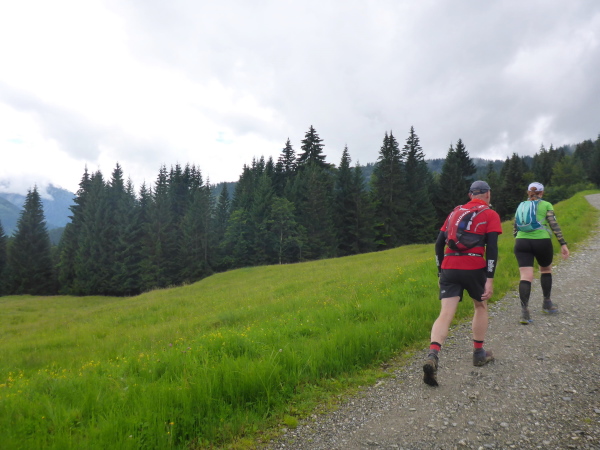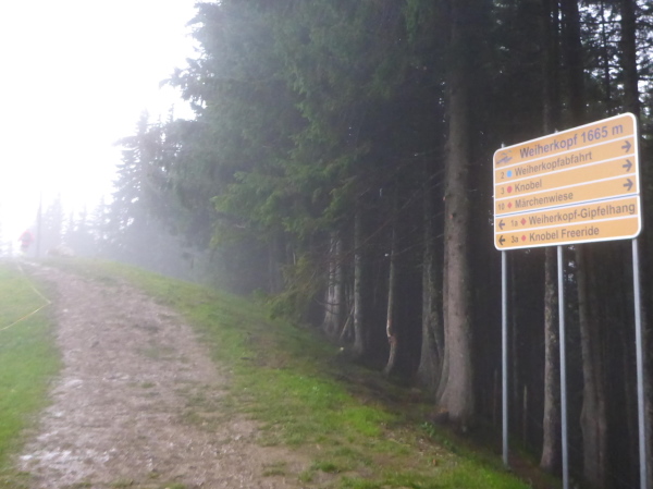 Es geht nun ein kurzes Stück auf der Straße und dann zur Schönberg Alpe. Es gibt keinen Umweg, ich muss mitten durch die Pfützen. Der Regen hat aufgehört, es ist nicht mehr so kalt. So behalte ich trotzdem warme Füße. Es folgt ein schönes Stück Singletrail zuerst im Wald, dann zwischen üppigen Blumen bergab. Hier steht normalerweise Karl-Heinz von den Johannitern und bewacht die Strecke. Heute ist keiner da. Schade, seine Aufmunterungen fehlen mir ein bisschen. An der Straße erreichen wir die Weiche für den Marathon, der hier nach links führt. Wir dürfen rechts weiter.
