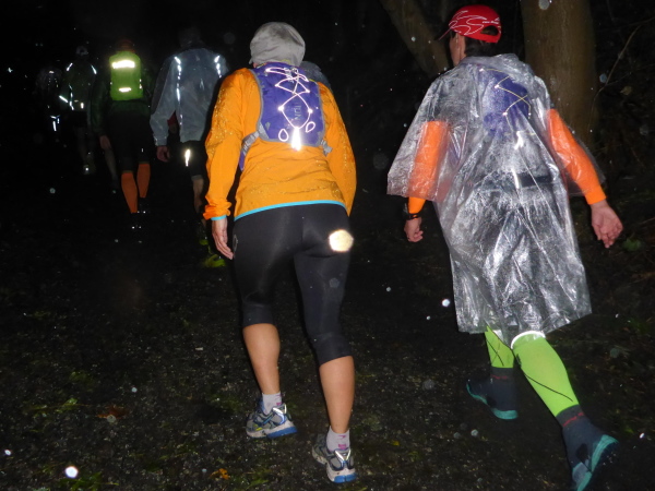 Hinter km 10 geht es dann richtig los: Ein schmaler Trail mit glitschigem Untergrund und nassen Steinen. Langsam beginne ich das Ganze zu genießen. Leidlich warm gelaufen, stelle ich fest, dass meine Schuhe in dem rutschigen Gelände optimal halten. Pfützen versuche ich noch zu umlaufen, und so sind meine Füße auch noch weitgehend trocken. Auch das Gros meiner Mitläufer scheint gut gelaunt. Ich finde immer wieder nette Gesprächspartner.