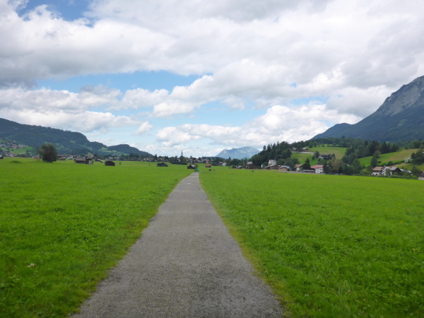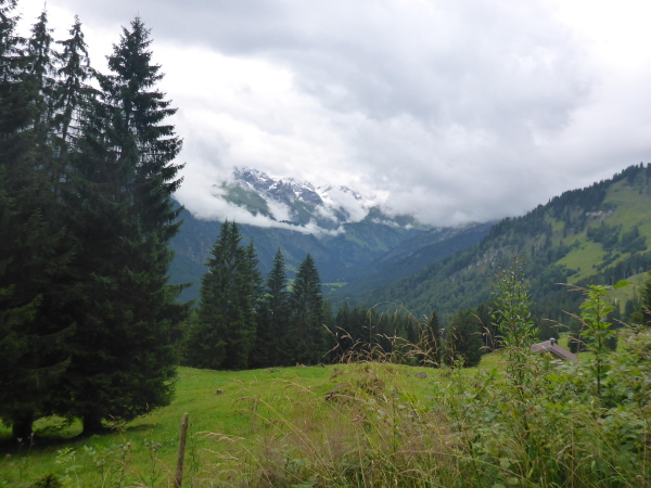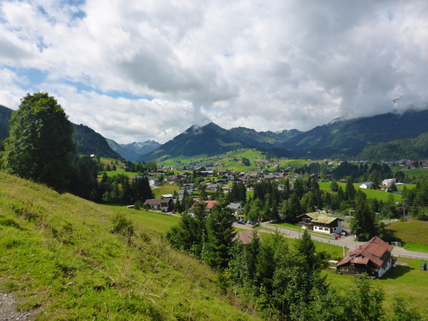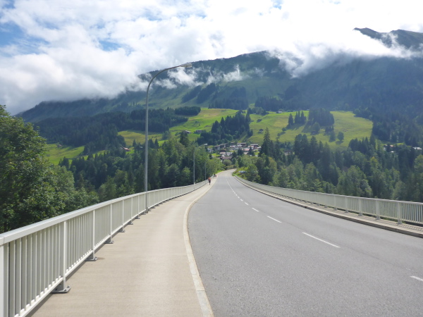 In Außerschwende ist Mittagszeit. Nur wenige Menschen sind auf der Straße. Es geht über eine hohe Brücke, unten muss wohl der Breitbach fließen, der größte Bach im Kleinen Walsertal. Ich verkneife mir einen Blick hinunter. Die Höhenangst lässt grüßen. Auf der anderen Seite liegt Unterwestegg. Helfer halten den Verkehr auf, damit wir gefahrlos die Straße überqueren können.