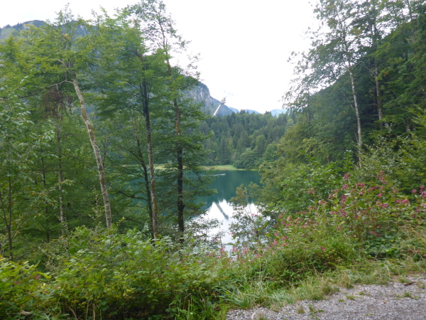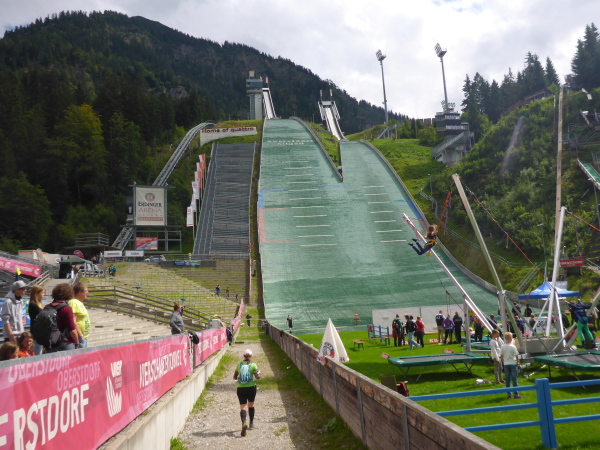 Als ich befürchte, gleich platt zu sein, wird der Weg endlich flacher und der Freibergsee liegt unter uns. Ich nutze eine offene Stelle für ein Foto und sehe eine Skiflugschanze im Hintergrund. Da ist die Erdinger Arena – denke ich. Stimmt aber nicht, das ist die Heini Klopfer Skiflugschanze außerhalb von Oberstdorf. Sie ist zurzeit die drittgrößte Skiflugschanze der Welt mit einem Schanzenrekord von 225,5 m. Der Sprungturm wird aufgrund seiner frei auskragenden Spannbeton-Konstruktion von den Einheimischen auch als „schiefer Turm von Oberstdorf“ bezeichnet. Bis heute gilt die architektonisch einmalige Schanze, die ausschließlich in Höhe des Absprungtisches mit Felsankern im Berg gehalten wird, als statische Meisterleistung. Architekt war der Oberstdorfer Claus-Peter Horle.