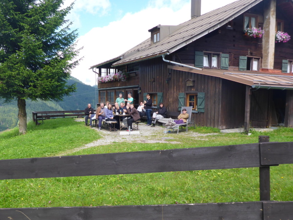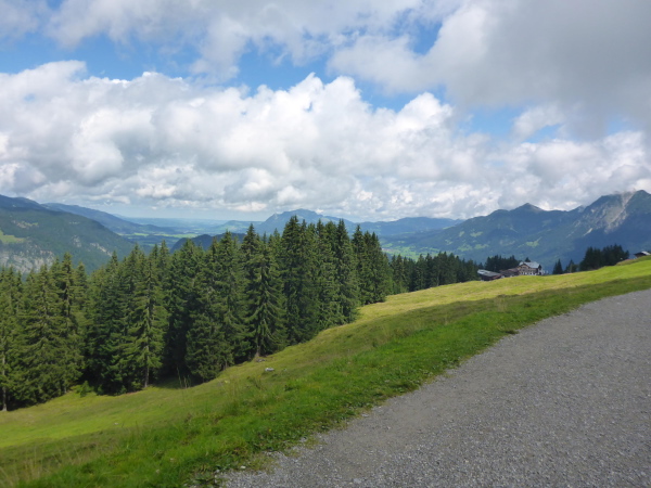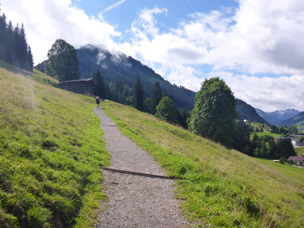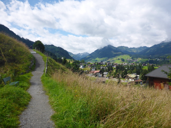 Das Kleine Walsertal ist eine österreichische Enklave. Wegen der hohen Berge gibt es keine direkte Verkehrsverbindung zum restlichen Österreich. Man muss immer durchs deutsche Oberstdorf fahren. Dahin wollen wir jetzt auch. Zunächst laufen wir auf einem Schotterweg zwischen grünen Wiesen bergauf. Auf Asphalt geht es dann weiter. Einmal ist es so steil, dass ich lieber die Treppen neben der Straße benutze. Von einer Hütte ertönt kräftiger Applaus: Die Gäste vergessen ihre Brotzeit und feuern die Läufer an. Ich freue mich.
