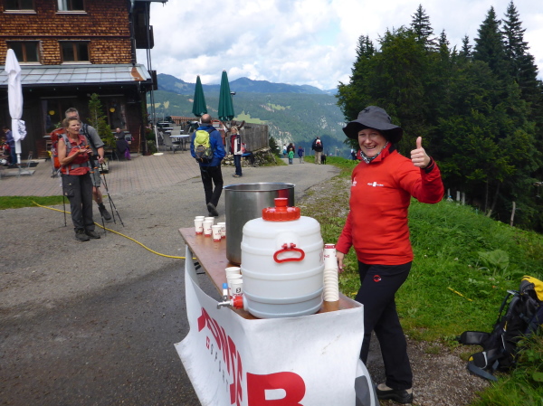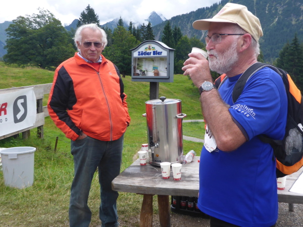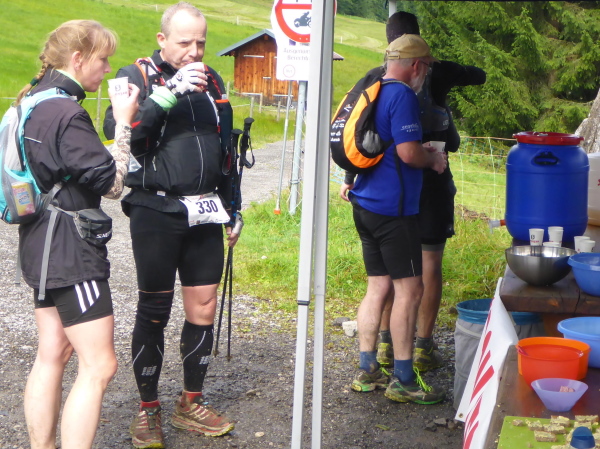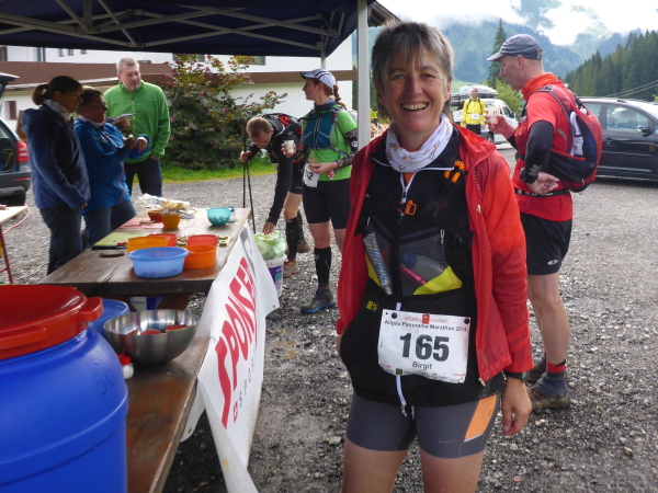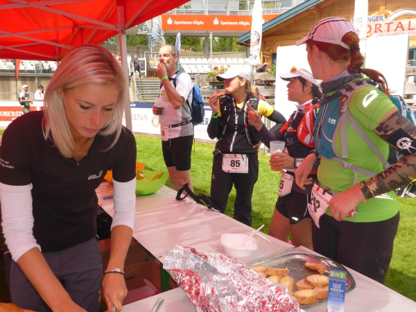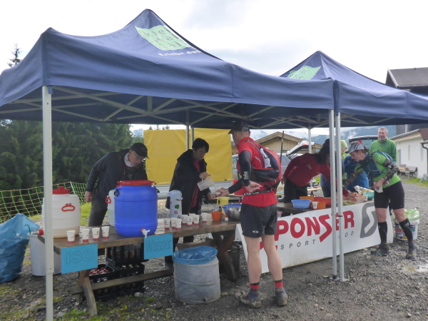 Es geht rechts auf einen Feldweg. Schritte von hinten künden Läufer an. Eveline und Tassilo laufen locker vorbei. Dann sind sie auch schon wieder verschwunden. Es geht bergab und wellig weiter. Wir überqueren jetzt die Grenze nach Österreich. Am Gasthof Hörnlepass bei km 35 erwartet uns die nächste Vollverpflegung. Erfreut greife ich zur warmen Brühe. Die Helfer sind wie überall sehr nett und zuvorkommend. Die Brote mit Kräuterbutter schmecken besonders lecker; es gibt diverses Obst und Gemüse. Was will man mehr? Nach ausgiebiger Stärkung mache ich mich wieder auf die Strecke.