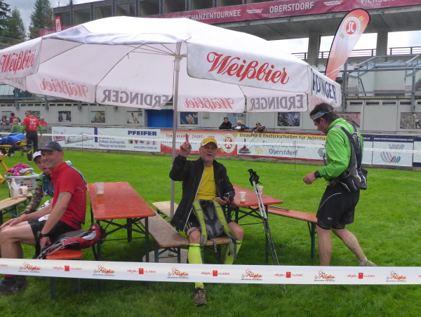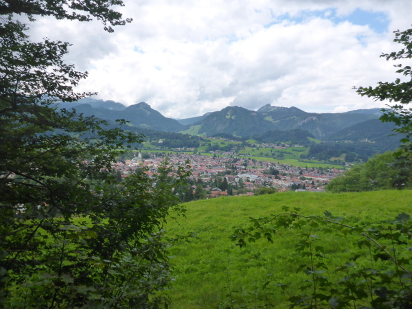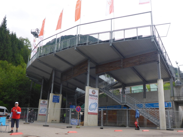 Wir laufen halb um den See herum. Dann geht es wieder bergab. Eine überdachte Holzbrücke führt uns über die Stillach. Helfer sichern die Straße. Oberstdorf, die südlichste Gemeinde Deutschlands, liegt vor uns. Ich hatte mir vorgestellt, dass die Skisprungarena mit ihren Schanzen vom weitem zu sehen wäre. Dem ist nicht so. Ich frage einen Passanten. Die Arena muss wohl hinter einem Berg sein. Welcher Berg? Hier sind so viele.