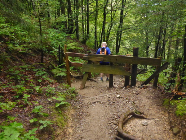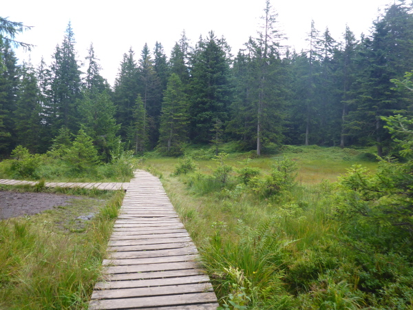 Zuerst geht es aber erst einmal steil bergauf. Im kühlen Wald auf gepflegtem Weg laufe ich Slalom durch die vielen Spaziergänger. Hier verläuft ein Naturerlebnisweg, der mit seinen zahlreichen Stationen nicht nur für Kinder sehenswert ist. Ich erreiche einem Holzsteg durch das Hühnermoos-Moor. Der Steg mündet am Ende des Moores in einen breiten geschotterten Waldweg, der erst flach und dann stetig abwärts zur Hochleite führt.
