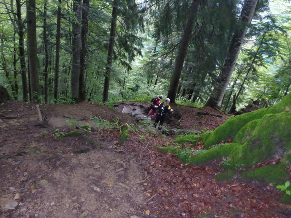 Am Berggasthof Hochleite steht eine kleine Getränkestation. Ich genehmige mir eine Cola. Siegfried ist auch wieder da. Dann geht es voll zur Sache. Erst gelangen wir auf einen schmalen Trail, dann geht es auf schmalem Wurzeltrail steil bergab. Siegfried lässt es langsam angehen und als wir noch zwei Mädels einholen, muss ich vorbei. Ich komme gut vorwärts. Doch der Weg scheint kein Ende zu nehmen. Mit der Zeit brennen die Oberschenkel und noch immer geht es weiter steil bergab.
