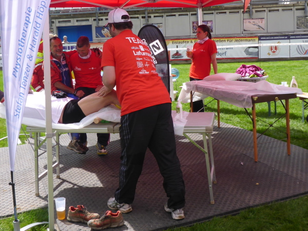 Es geht in den Ort hinein. Rechts der Straße liegt die Lorettokapelle. Autos fahren vorbei, die Insassen winken mir zu und feuern mich an. Pfeile zeigen nach rechts. Vor ein paar Fahrradfahrern überquere ich die Straße. Es geht zu Füßen des Krappbergs auf einen Radweg. Ich bin ganz allein, es gibt auch keine Häuser, nur Bäume. Dann bin ich plötzlich mitten im Ort. Viele Fußgänger erschweren das Laufen. Ich weiche auf die Straße aus und sehe vorne auf der anderen Seite einen Helfer. Also rüber über die Straße. Er sagt meine Startnummer in sein Walkie-Talkie und weist mich nach links. Wieder Slalom um die Spaziergänger. Wo geht es lang? Nochmal rechts; jetzt muss ich auch noch bergauf! Wieder stehen hier Helfer. Ich überquere erneut eine Straße. Und wieder bergauf. Dann sehe ich endlich die Arena. Ein Helfer meldet mich per Funkgerät an. Ich suche den Eingang. Dann betrete ich über die Zeitmessmatte das innere des Stadions. Naja, das Publikum ist gerade wenig motiviert. Kann ich auch gut verstehen. Trotzdem ist die Situation ein ganz besondere. Die Stadionatmosphäre raubt mir kurz den Atem. Auf weichem Gras noch eine Runde. Da ist der Verpflegungsstand.