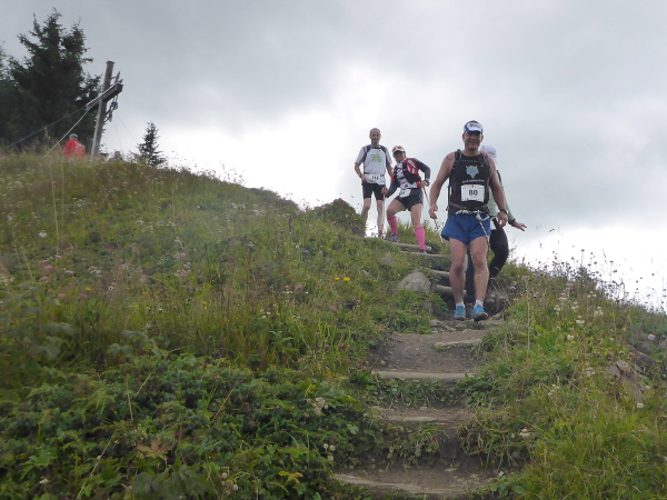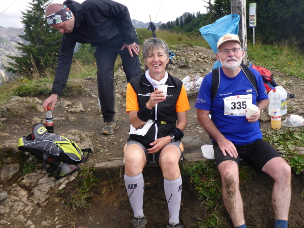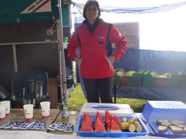 Zuerst geht es große Stufen hinunter, dann am Grad entlang. Der nun folgende Wiesenweg ist bergab sehr rutschig. Kurz hinter km 60 steht dann erneut eine VP mit richtigem Essen. Ich genieße etwas Melone und Brot und entdecke den von mir vermissten Johanniter Karl-Heinz. Auch den anderen Läufern ist sein Fehlen aufgefallen. Er erklärt, dass er nichts dafür kann und heute erst verspätet auf seinem Posten an der Marathonweiche eingetroffen ist. Jetzt wissen wir das auch.