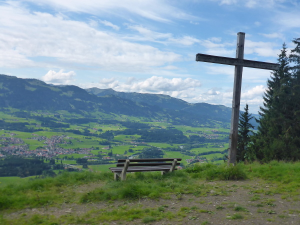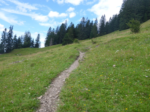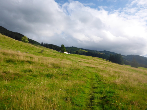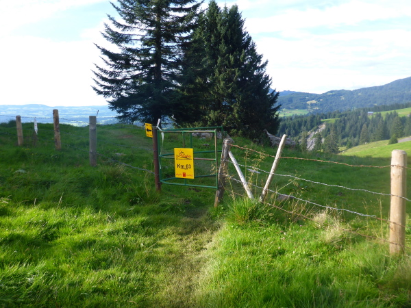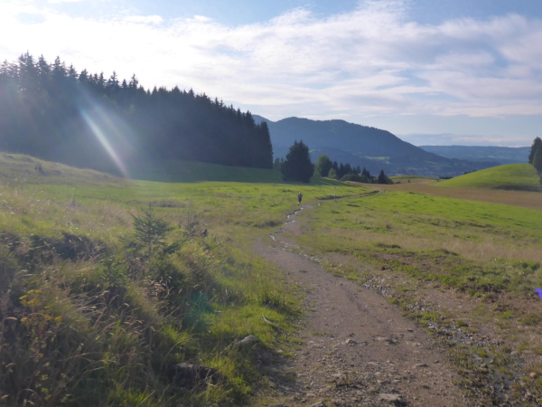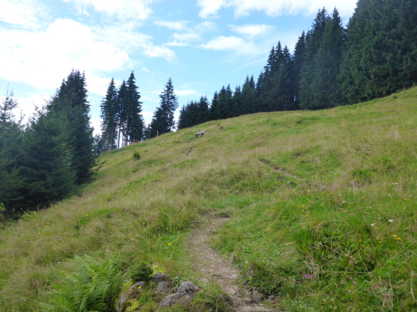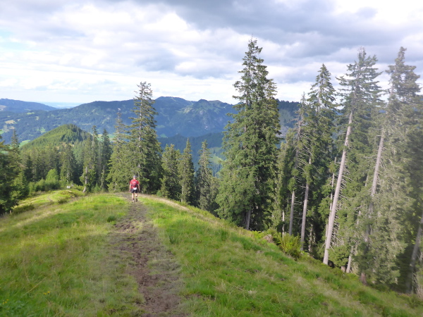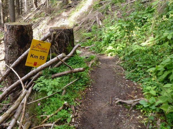 Hinter der Hütte beginnt nun ein wunderbarer Singletrail. Wenn ich noch mehr Kraft hätte, könnte ich ihn noch besser genießen. Erst steil bergauf, dann wellig weiter. Teilweise durch den Wald, teilweise über Wiesen, wandere ich dahin. Ein einsames km 55 Schild motiviert mich. Ein Gipfelkreuz sorgt schon mal für Siegergefühle. Dass es hin und wieder bergab geht, stimmt mich hingegen sauer. Ich will endlich hoch.