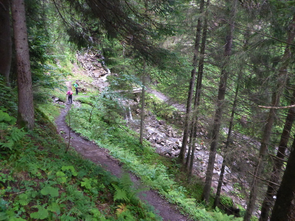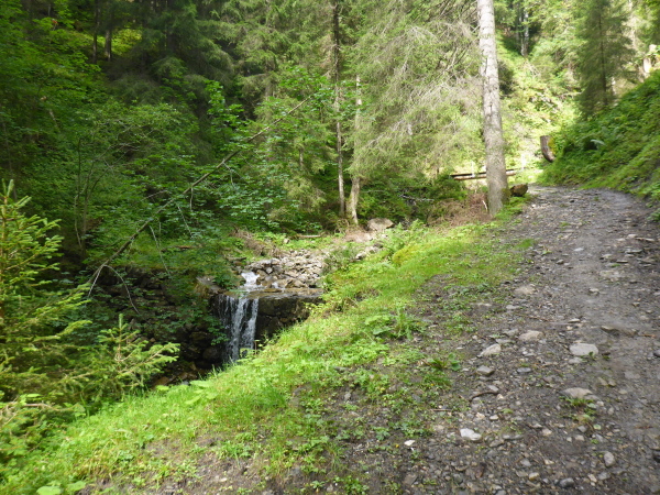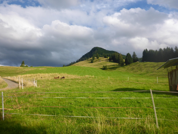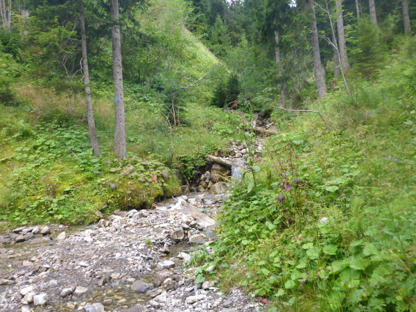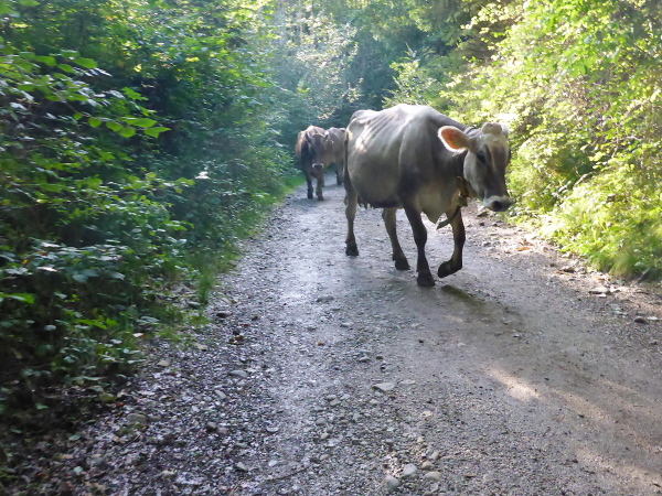 Wieder bergab kommen mir plötzlich Kühe entgegen. Zuerst nur drei, dann vier, und dann kommt die ganze Herde den Weg entlang. Da rechts und links Büsche sind, gibt es kein Ausweichen. Gott sei Dank bilden die Kühe eine Gasse, so dass ich in der Mitte durch kann. In Hofen (km 66) passt ein Helfer auf, dass man den Abzweig nicht verpasst. Es geht nun tatsächlich nur noch bergab. Ein frisch geschotterter Weg bringt uns an den Schwarzbach. Ich könnte den Weg besser genießen, wenn ich nicht so müde wäre. Hier ist es wunderschön, aber ich sehne bloß das Ziel herbei.