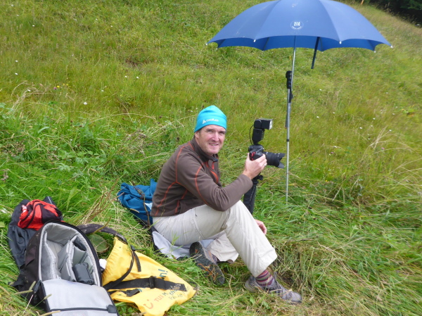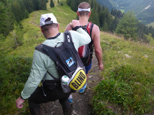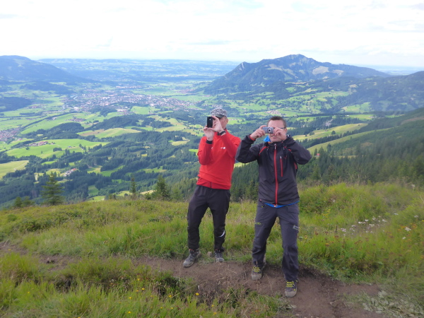 Der Untergrund wird nun schwieriger. Der Weg ist doch ziemlich aufgeweicht und matschig. Siegfried hat mit seinen Straßenlaufschuhen massive Probleme. Mir machen mittlerweile die hohen Stufen zu schaffen, die hier zu ersteigen sind. Entgegenkommende Wanderer berichten, dass der Gipfel nahe ist. Wir können schon die lauten Anfeuerungsrufe der Helfer hören. Dann liegt er tatsächlich über uns. Noch ein paar Schritte und ich bin oben. Ein Helfer hilft den Akku zu wechseln. Das Gipfelfoto mit dem sehbehinderten Didi und seinem Guide Jürgen ist Ehrensache.