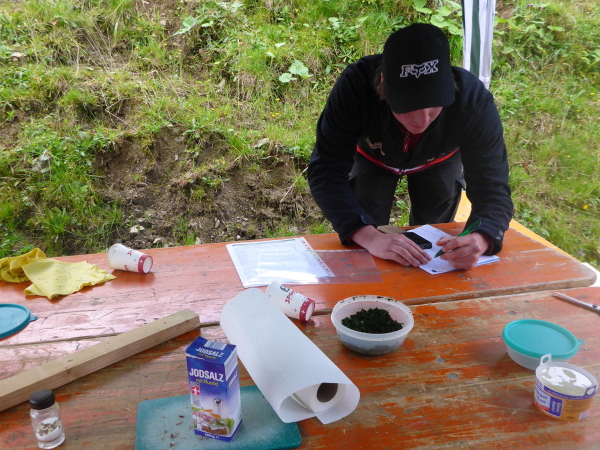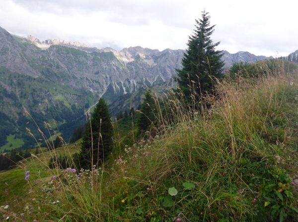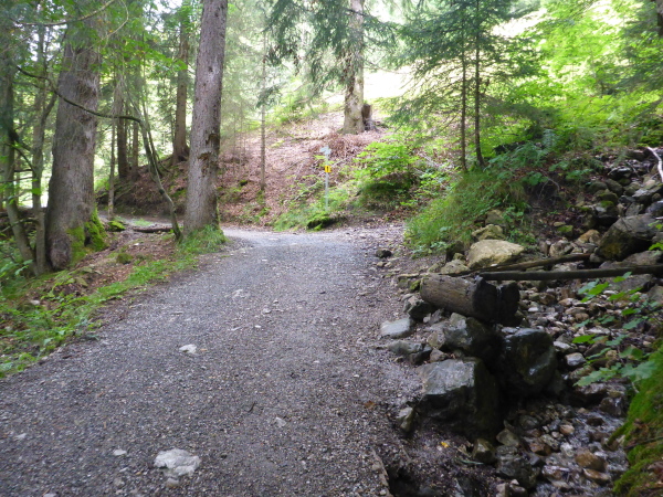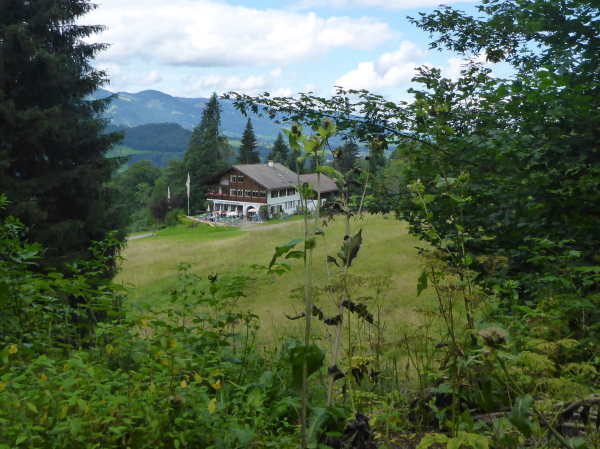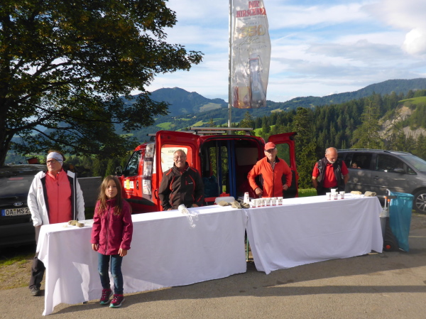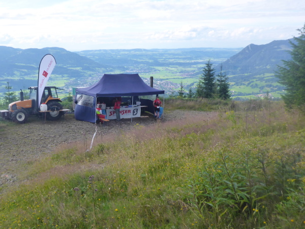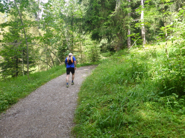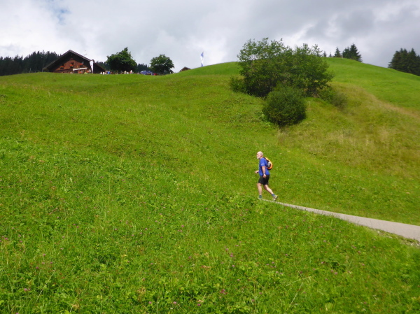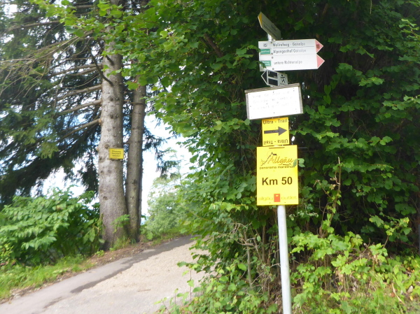 Beim km 50-Schild liegt Oberstdorf schon weit unten und die Strecke biegt auf einen Schotterweg ein. Siegfried kommt wieder einmal vorbei, dann Veronika und Jan. Ich bleibe bei meinem Tempo. Ein paar Körner will ich mir noch aufsparen. Und dann geht es plötzlich bergab. Und das nicht nur ein bisschen. Die ganzen wertvollen Höhenmeter, die ich bereits gemacht habe, gehen verloren. Ich bin verwirrt. Die Helfer sagten doch, es würde jetzt 10 km bergauf, und dann 10 km bergab gehen. Prompt geht es wieder bergauf, nur um dann gleich wieder bergab zu gehen. Auf der Straße laufe ich kurz an einem Bächlein entlang. Dann liegt der Aufstieg zur Gaisalpe vor uns. Naja, Aufstieg ist vielleicht übertrieben, da haben wir schon anderes hinter uns. Aber immerhin geht es bergauf. An der Hütte mit regem Ausflugsverkehr liegt die Getränkestation