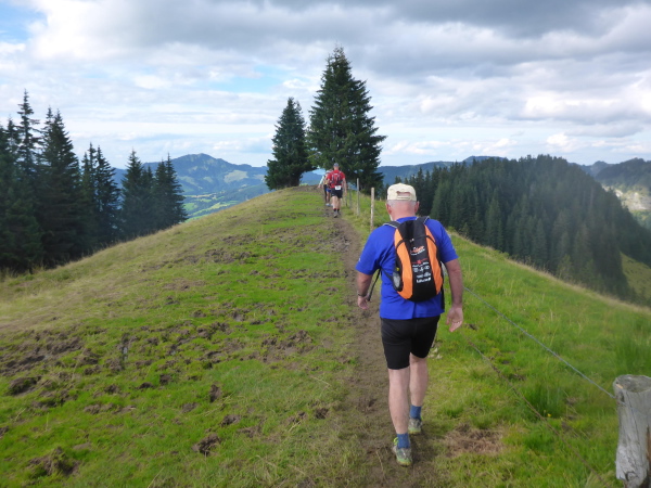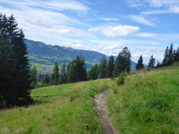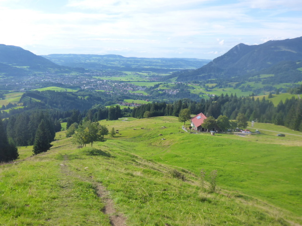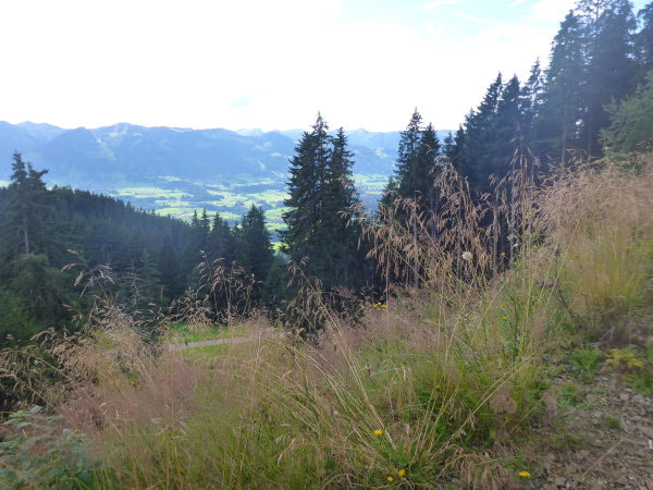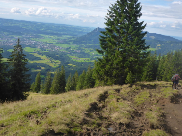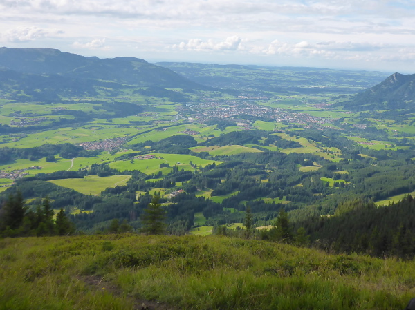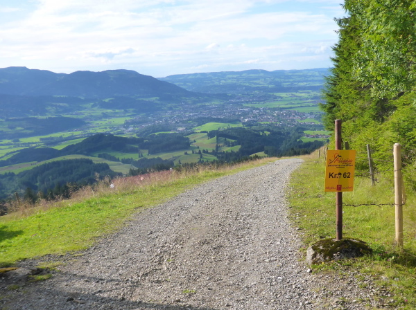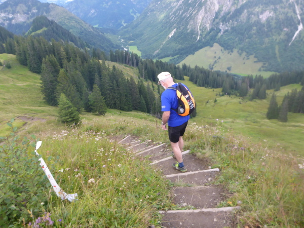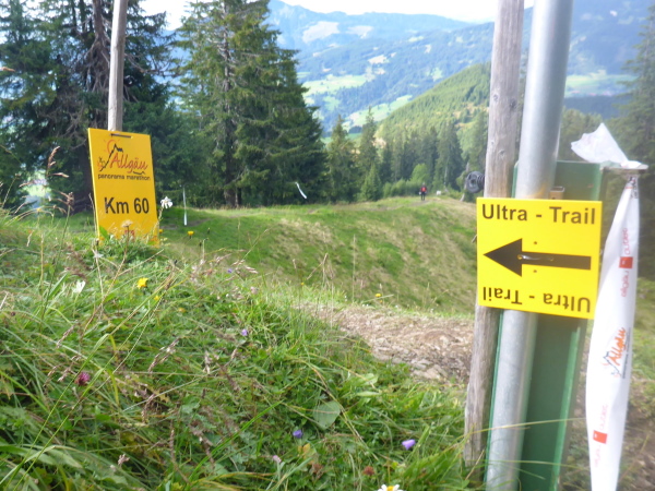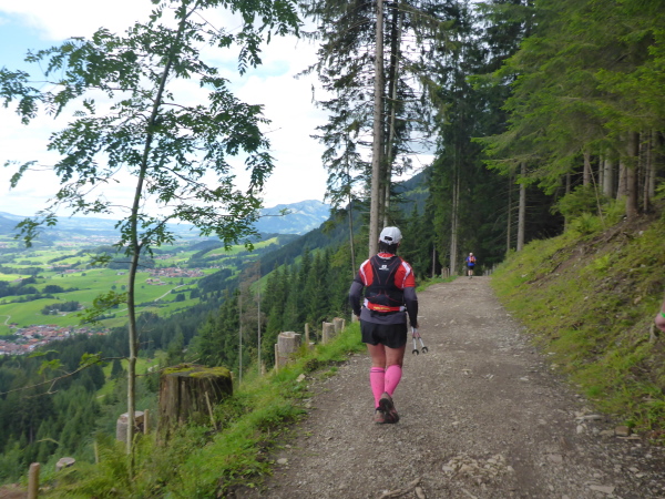 Einzeln machen wir uns weiter auf den Weg. Bei mir geht es jetzt gut. Der Weg ist zwar steinig, aber durch das moderate Gefälle angenehm zu laufen. Hinter km 62 verlassen wir den Wald und haben einen tollen Ausblick. Sonthofen kann ich zwar nicht entdecken, aber weit kann das ja jetzt nicht mehr sein. Wir laufen auf die Straße die in Serpentinen nach unten führt. Dann ist bei mir plötzlich der Ofen aus. Mein rechtes Knie hat schon auf dem schweren Abstieg nach Oberstdorf hinunter geschmerzt. Nun sind die Beschwerden wieder da und werden schlimmer. Dazu gesellt sich auch noch ein ungewohnter Schmerz im linken Fuß. Dass Hüfte und Beine weh tun, brauche ich ja nicht zu erwähnen. Im steifen Joggingschritt bewege ich mich langsam bergab.
